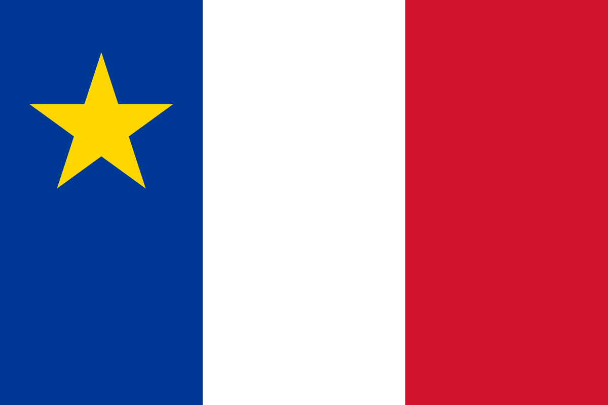 Флаг акадийцев представляет собой французский триколор с золотой звездой на синем поле (см. начало статьи). Она символизирует святую Марию, Богоматерь Успения, покровительницу акадийцев, широко известную как «Морская звезда». Этот флаг был предложен отцом Марселем-Франсуа Ришаром и принят в 1884 году на Втором национальном съезде акадийцев, состоявшемся в Мискуше, на острове Принца Эдуарда.