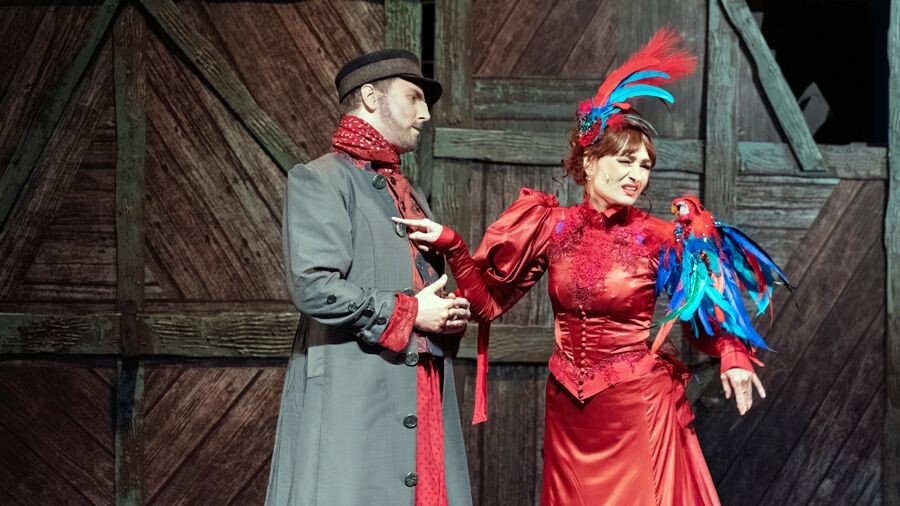 Да-да, в этом спектакле «рассказывает» волшебную сказку и цветовая палитра костюмов: усталые серо-коричневые оттенки у горняков и их жен (тяжелая жизнь, она родная и по-своему уютная, но в ней так мало радости), только у Данилы и его невесты Аннушки одеяния светлее. Вызывающе красные косоворотка и шейный платок у Мормагона и алое, почти маскарадное, платье с перьями у его жены. Великолепны наряды и головные уборы Хозяйки — сверкают каменьями, на плече примостилась ящерица, охраняющая свою повелительницу. Художник Виктория Севрюкова сосредоточена на деталях: разнообразие платков, кокошников, расшитые рубахи, сарафаны с вышивкой, душегреи с аппликациями — вызывают восхищение своей красотой и этнической достоверностью.