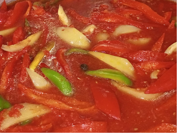 Каждый год готовлю только так и никак иначе, лечо получается очень вкусным и густым. Открытая баночка уже не попадет в холодильник или в какое либо блюдо. Очень быстро съедается. Рецепт от моей бабушки из записной книги. Такое лечо нужно попробовать приготовить, обязательно. Ингредиенты: - помидоры – 2,5 кг.; - перец сладкий, болгарский, мясистый – 2,5 кг.; - масло растительное – 50 мл.; - сахар – 1 стакан или 200 гр.; - соль – 1 ст. ложка со средней горкой, 25 гр. или по вкусу; - очищенные зубчики чеснока – 4-5 шт.; - перец черный горошком – 8 шт.; - перец черный душистый – 4 шт.; - лавровый лист – 2 шт. по желания (я не использую) - уксус 70% - 1 ч. ложка. Подготовить все ингредиенты. Помидоры пропустить через мясорубку. Перец нарезать полосками или как нравится примерно 1-1,5 см. шириной. Чеснок мелко измельчить ножом. В подготовленную емкость для тушения добавить растительное масло, пропущенные через мясорубку томаты, соль, сахар и проваривать, периодически помешивая 25 минут. Фото