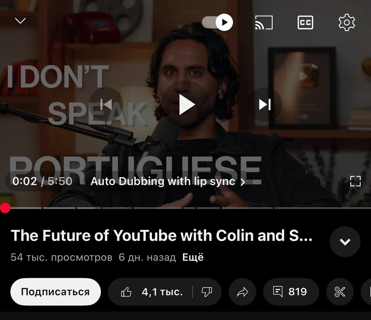 Пока я веду свой Испанский канал переводя видео в HeyGen – YouTube вводят автоматический дубляж видео с ЛИПСИНКОМ. Т.е. то, за что я плачу подписку и еще дополнительно кредиты покупаю теперь в YouTube встроено… А еще я длинные видео через Magic Clips в Shorts нарезаю. Тоже платный сервис… Так знаете что? И это YouTube вводит. VEO генератор нейро контента в Shorts тоже вводят, но это уже другая история. Не моя. Главный вопрос – почему все так бояться создавать ИИ контент в ютуб, когда сам YouTube активно внедряет эти сервисы?! Вот тут видос, а в комментах можем обсудить куда катиться мир и что мы будем смотреть через пару лет.