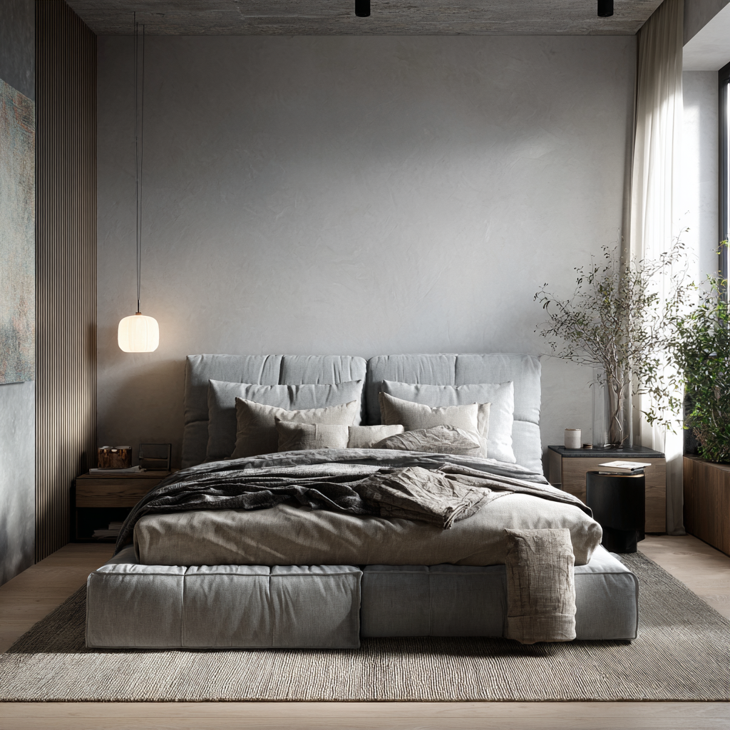 Если фон и главный персонаж не совпадают по стилю, интерьер разваливается: кровать теряется, стена перетягивает внимание или всё вместе превращается в хаос. А теперь разберём три приёма, которые дизайнеры используют в спальнях уровня Pinterest. Хочется спокойной, «дорогой» спальни без лишнего пафоса? Тогда делаем стену и кровать в одной гамме. 👉 Пример: серое изголовье на фоне чуть более светлой серой стены.