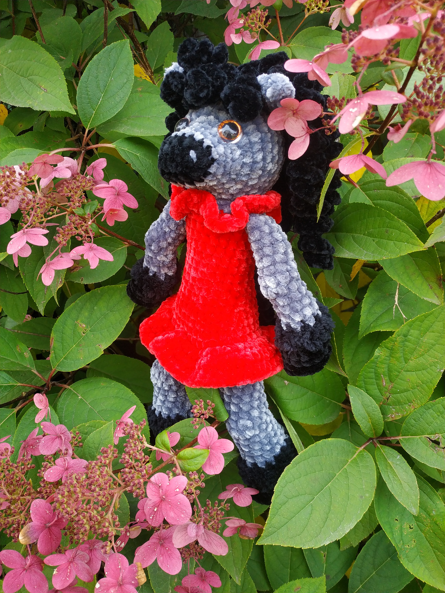 1. 1. Плюшевая велюровая пряжа, состав 100% микрополиэстер, в одном мотке 100 грамм на 120 метров: цвет тела и головы основной - серый - чуть менее 1 мотка, дополнительный цвет – чёрный - 1 моток, этим цветом вяжем копыта, мордочку, хвост, чёлку, гриву. Цвет платья- красный - половина мотка, или 2/3 мотка (если юбка будет пышная из трёх ПССН).