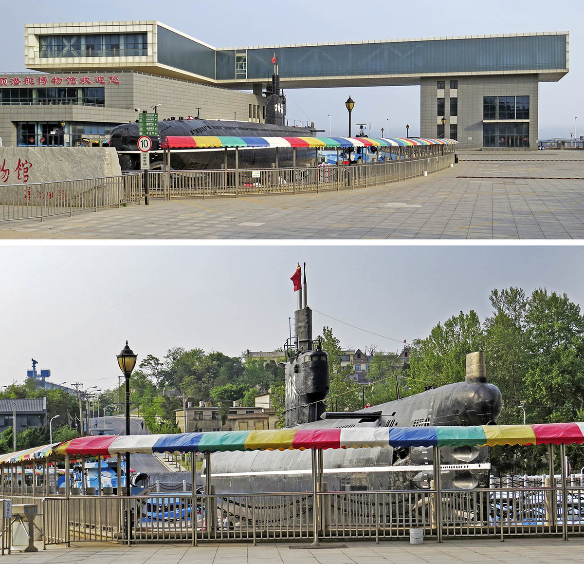 От Старого города в Порт-Артуре и до берега Жёлтого моря недалеко - только объехать промзону и зелёные склоны Золотой горы по улице Хуанцзинь. На берегу встречает музей, выросший к 2015 году вокруг небольшой (длина 77 метров) дизельной подводной лодки "проекта 033", по сути - клона советских субмарин "проекта 603": те строились в 1957-61, а эти в 1962-84 годах. Всего у Китая было 84 таких подлодки, и 33 из них сохранились в музеях и учебках: Ещё техника: справа бронетранспортёр YW531, слева плавающий танк тип 63А (глубокая модернизация ПТ-76), ближе - китайский аналог старого зенитно-ракетного комплекса С-75. А вот эта пара противокорабельных ракет - уже не музейный экспонат... ...а памятник на территории какого-то военного объекта. В его КПП мы упёрлись, попытавшись чуть дальше от берега взойти на Электрический утёс к легендарной батарее №15, где обороняли город в том числе отец и сын Николай и Анатолий Степановы. Младшему было всего 12 лет, но 30 лет спустя он написал "Порт-Артур" -