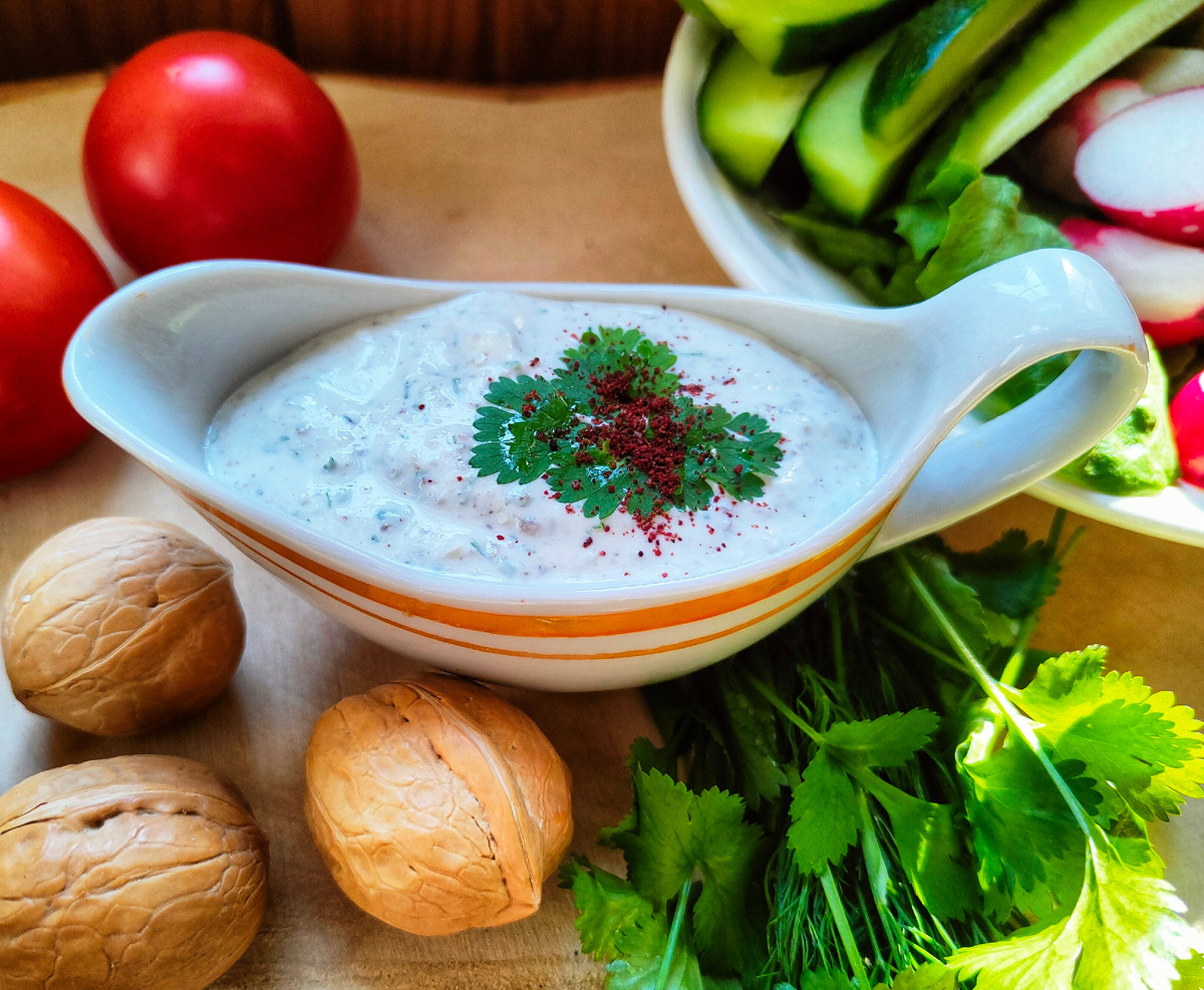 Очень вкусный соус, который в Осетии принято подавать к мясу или рыбе. Но я могу вам точно сказать, что с ним вкусно всё: и овощи, и долма 😊👍 - мацони 100 г (можно заменить на натуральный йогурт или нежирную сметану) - орехи грецкие 2 шт. крупных - чеснок 1 крупный зубчик - перец острый свежий или сухой по вкусу - зелень укропа, петрушки, кинзы несколько веточек - соль по вкусу - приправы хмели-сунели, уцхо-сунели, молотый кориандр Если используется свежий перец, его обычно приваривают, чтобы убрать лишнюю остроту. Затем необходимо порубить его, а также орехи, чеснок и зелень как можно мельче, ножом или кухонным измельчителем. Смешиваем всё перечисленное с мацони или другим кисломолочным продуктом: ☝️Если используете сметану, она не должна быть густой. Добавляем по вкусу специи и соль: Всё перемешиваем - соус готов: Перекладываем в соусник. Для украшения я использовала листочки кинзы и приправу сумах с кисловатым вкусом: Храниться соус в холодильнике не более суток, поэтому р