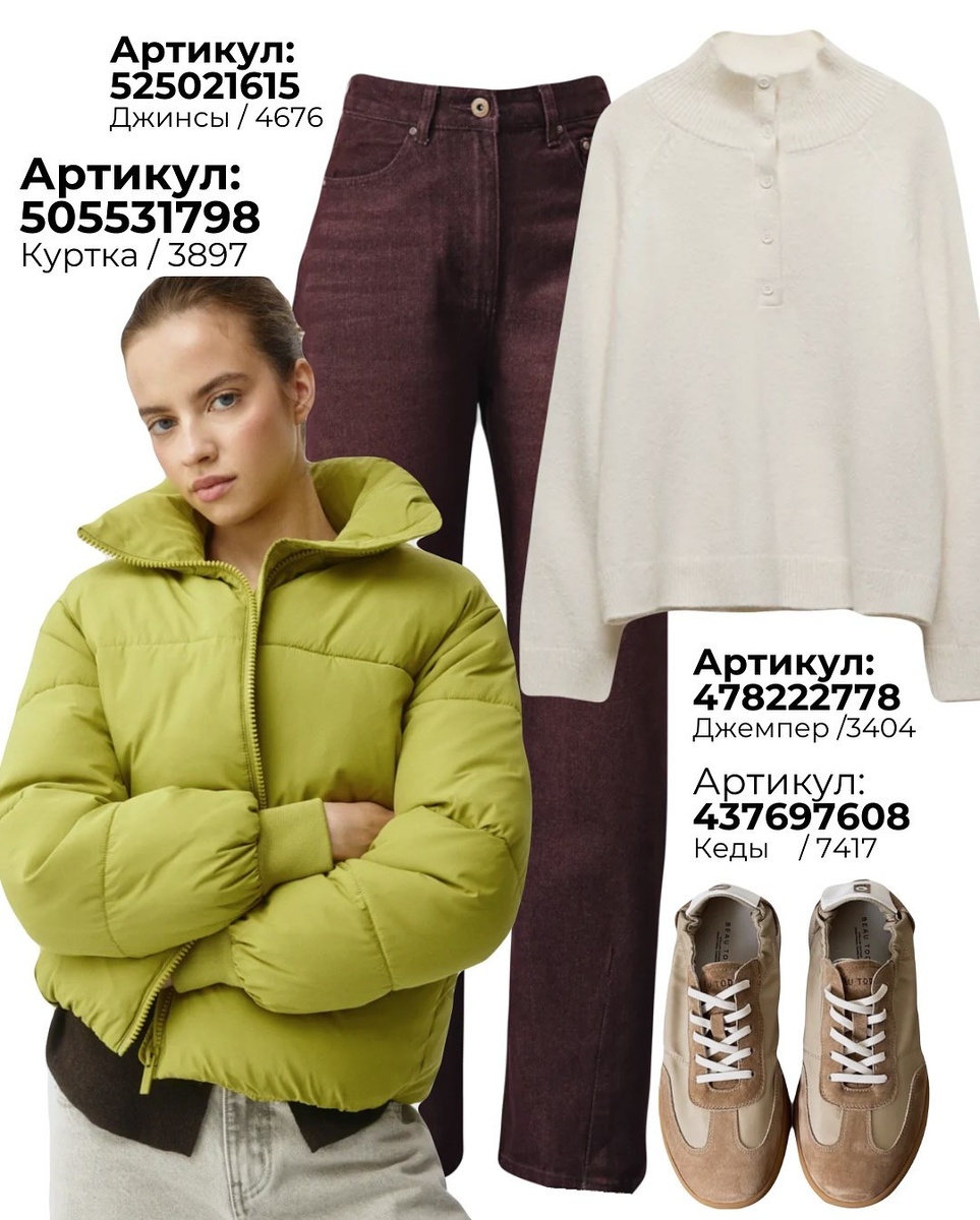 - Образ 1 — для «быстрых» дней, когда хочется энергии: лаймовый пуховик (505531798), сливовые джинсы (525021615), молочный джемпер (478222778), бежевые кеды (437697608).