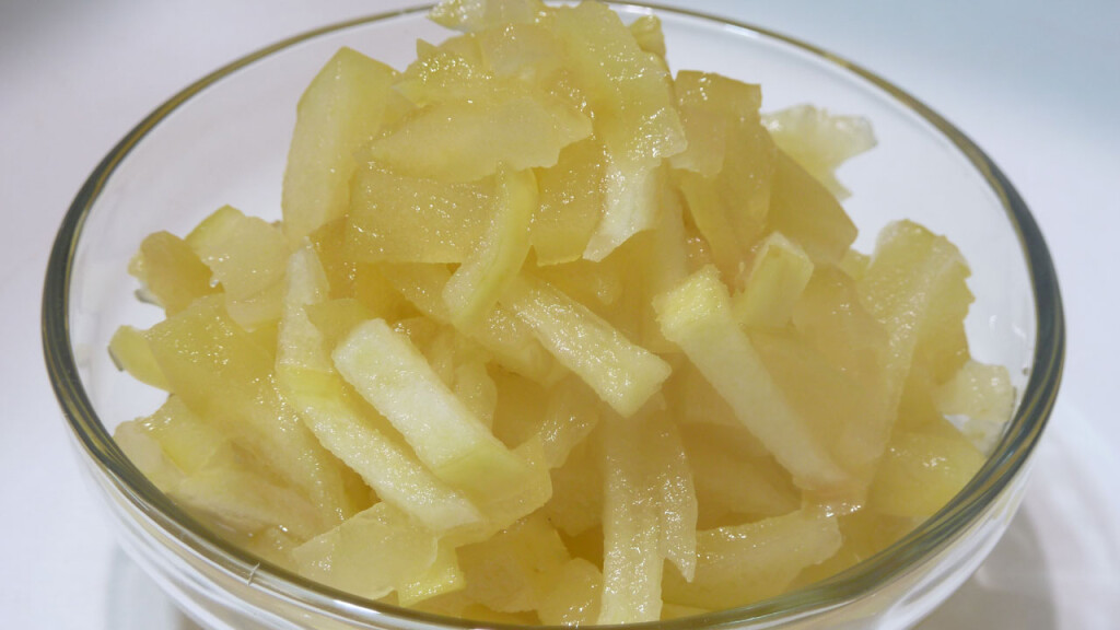 сахар — 200-300 г Сегодня я буду готовить яблочную начинку с небольшим количеством сахара для зимнего хранения. В этом рецепте на 1 килограмм яблок берется 200-300 г сахара. Для начинки лучше использовать плотные и твердые яблоки. Хорошо подойдут осенние сорта. Яблоки я разрежу на четвертинки и удалю сердцевину. Если кожура у яблока твердая, то ее тоже можно убрать. Яблочко можно потереть на терке, или нарезать мелкой соломкой. Я взвешиваю яблоки уже нарезанными. Затем добавляю необходимое количество сахара. Чашку с яблоками слегка встряхиваю, чтобы сахар опустился вниз и яблоки дали сок. В это время можно заняться банками. Вымыть банки с горчичным порошком или содой, простерилизовать над паром, а крышки обдать кипятком. Через 20-30 минут в яблоках уже появляется достаточное количество сока. Его хорошо видно. Я переложу яблоки в кастрюлю с толстым дном и поставлю на медленный огонь. С момента закипания начинку стоит поварить 10-15 минут. Постепенно яблоки становятся прозр