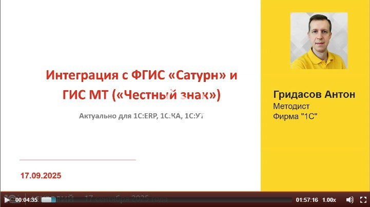 ‼️Об интеграции с ФГИС "Сатурн" и ГИС МТ ("Честный знак") рассказал Антон Гридасов, эксперт 1С в лекции на тему Новое в программах 1С:ERP и 1С:КА версии 2.5.24 и 1С:УТ версии 11.5.24 ✅ Дополнительно доступна презентация лектора 👉 Смотрите бесплатно полную видеозапись лекции 🚨Подписывайтесь на @lector_1c