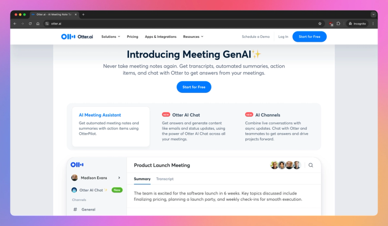 Otter AI — популярный сервис автоматической транскрибации, известный своей транскрипцией встреч в реальном времени и возможностями для совместной работы. Будучи одним из первых лидеров в области ИИ-конспектирования для встреч, его понятный интерфейс и интеграция с Zoom/Teams делают его идеальным выбором, когда вам нужны мгновенные заметки о встречах. Отличительной особенностью сервиса является его ИИ-помощник для встреч, способный автоматически присоединяться к виртуальным встречам для их транскрибирования в реальном времени, создавать резюме под названием «Жемчужины встречи» и идентифицировать докладчиков. Этот инструмент обеспечивает кроссплатформенную доступность (веб, мобильные устройства), функции совместной работы, такие как общие транскрипты и комментирование, и ориентирован конкретно на транскрипцию на английском языке (США/Великобритания) с живым переводом. Интеграция с календарем позволяет боту автоматически присоединяться к запланированным встречам, гарантируя, что вы зафиксируете каждый звонок.