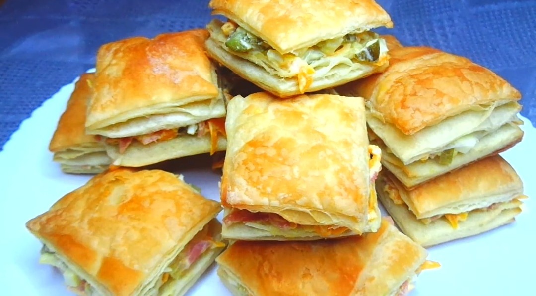 - Слоеное дрожжевое тесто разрезать на квадратики, примерно 6×6 см.