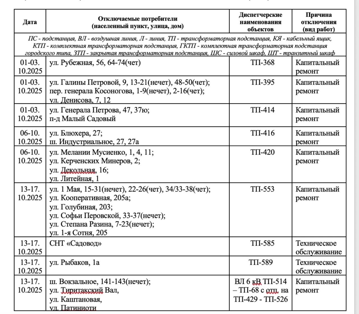Керчанам сообщают график плановых отключений электроэнергии на октябрь