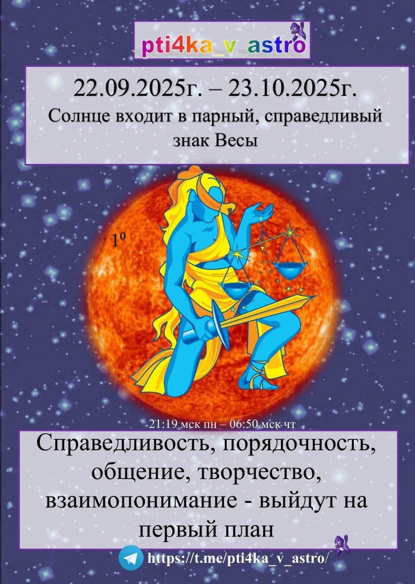 🥮 Здравствуй астрономическая Осень ☀️♎ Солнце в Весах с 22.09.2025г. 21:19:10 мск по 23.10.2025г. 06:50:44 мск ☀️ Солнце входит в дипломатичный и тактичный знак Весы ♎ 🍂 Именно с переходом Солнца в знак Весы приходит осенняя хандра - и это не случайно, Солнце перестает греть и радовать нас 🔥 Именно сейчас наступает прекрасная возможность прокачать свое Солнышко, чтоб добавить жизненных сил, энергии в это листопадное время Тем более сегодня Марс зашел в сильное для себя положение 🌚 Эта осень особенная, 21.09.2025г. было Солнечное затмение, которое также принесет отголоски в нашу жизнь 🌝 Важно до 21.10.2025г., привнести новое в свою жизнь: - начать обучение; - составить подробный рабочий план на месяц/год - возобновить дело, которое откладывали в долгий ящик - начните вести список доходов и расходов - займитесь самопознанием ✍️ Кому интересно пишите в ЛС или ставьте смайлик в комментариях под постом Так, я увижу ваш интерес и желание изменить себя 😉 #солнце #оракул #астр