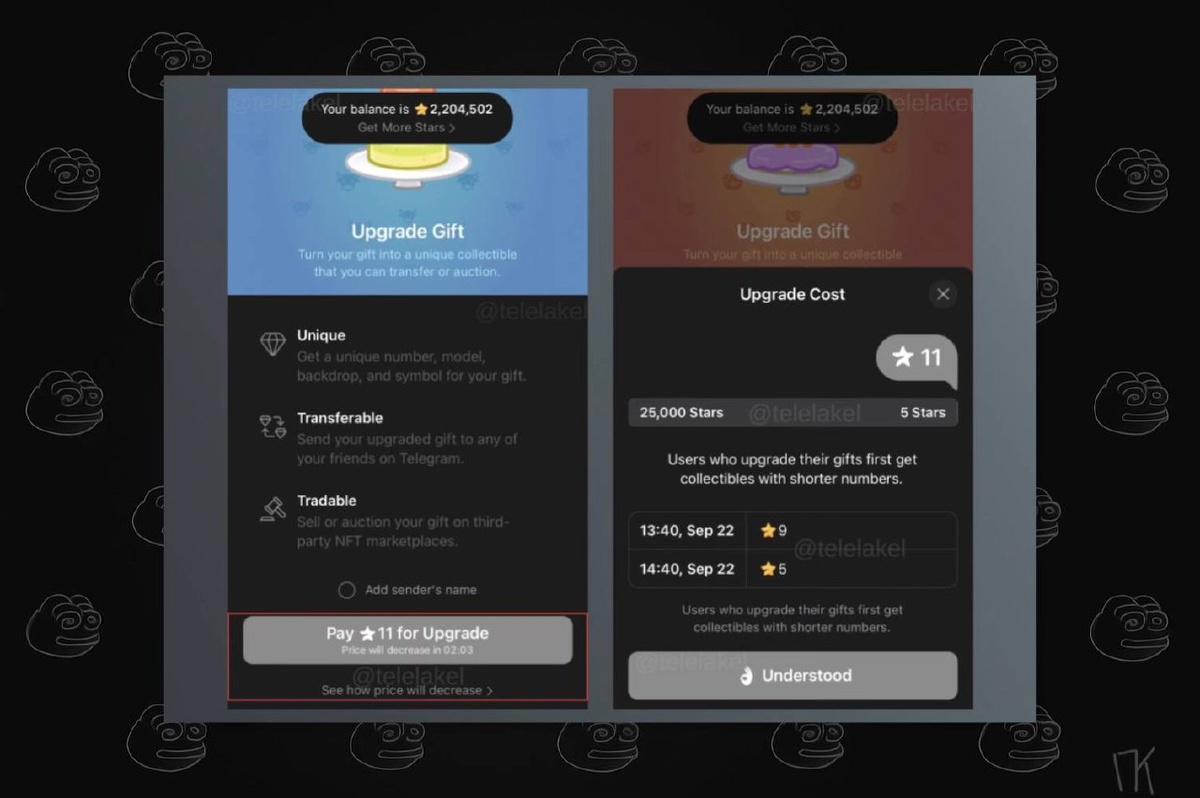 🎁 ТАЙМЕР ПРИ УЛУЧШЕНИИ В новом обновление Telegram Beta для iOS (v12.1.0) — будет висеть таймер и показывать когда цена на улучшение упадёт, так же будет видна подробная информация о цене, точное время и дату снижения и какая новая стоимость будет после снижения Осталось теперь дождаться это самое обновление, таймер на снижение цены улучшения - удобная тема, не придется высчитывать самому или искать по чатам инфу ➖➖➖➖➖➖➖➖➖ #gifts #подарки #telegram Чат • Portals • Mrkt • Tonnel • Купить Звёзды • Биржи