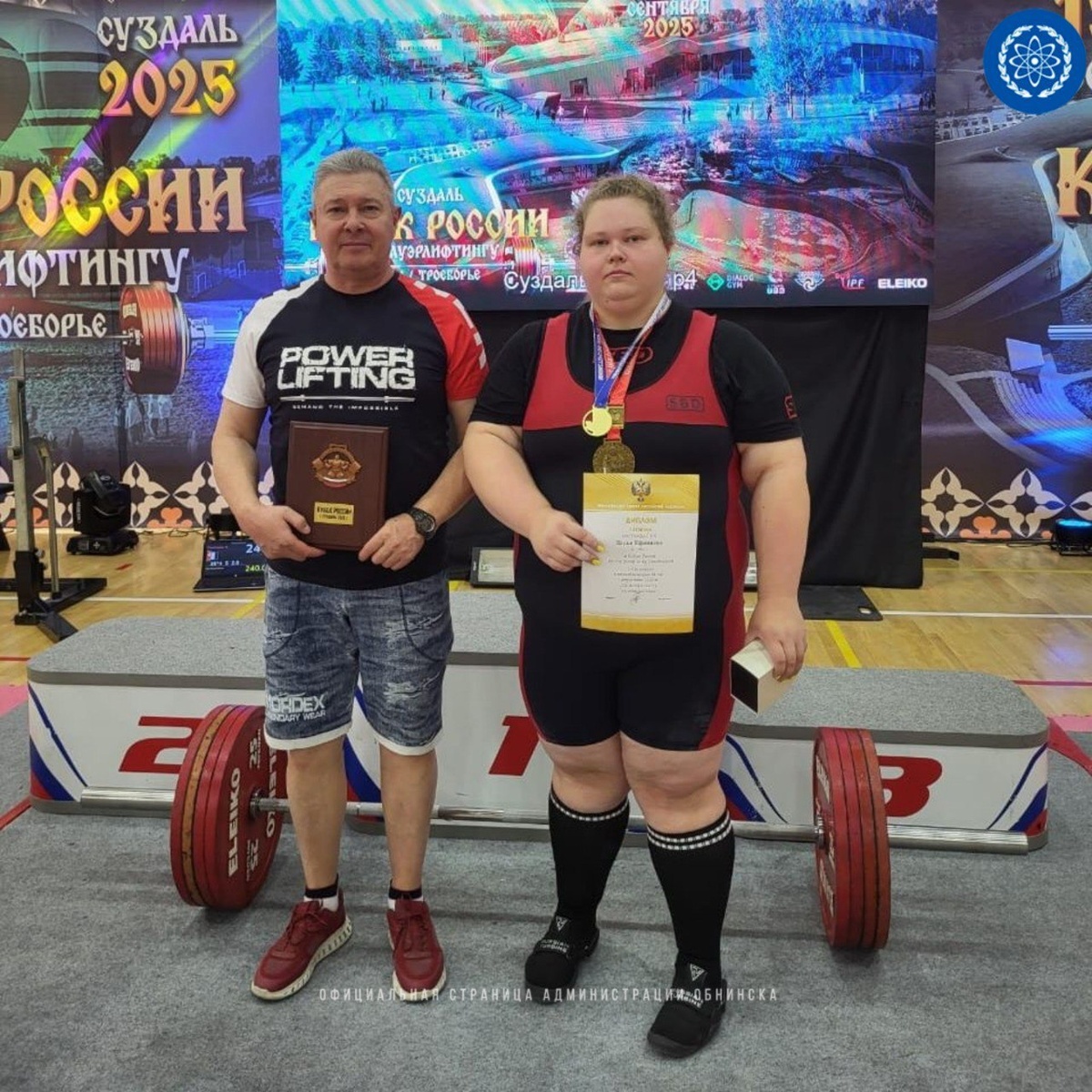 🥇 Спортсменка из Обнинска установила новый рекорд России по пауэрлифтингу Дарья Ефимцева из Обнинска заняла первое место на Кубке России по пауэрлифтингу. Соревнования проходили с 15 по 20 сентября в Суздале. Выступая в весовой категории свыше 84 кг, Дарья установила новый рекорд России в жиме лежа в экипировке. Спортсменка успешно справилась с весом 231 кг. Этот результат на 1 кг превышает текущий мировой рекорд, который составляет 230 кг. Поздравляем Дарью Ефимцеву и её тренера Владислава Хабаровского с высоким спортивным достижением и желаем новых побед! #обнинскспортивный #поздравляемигордимся