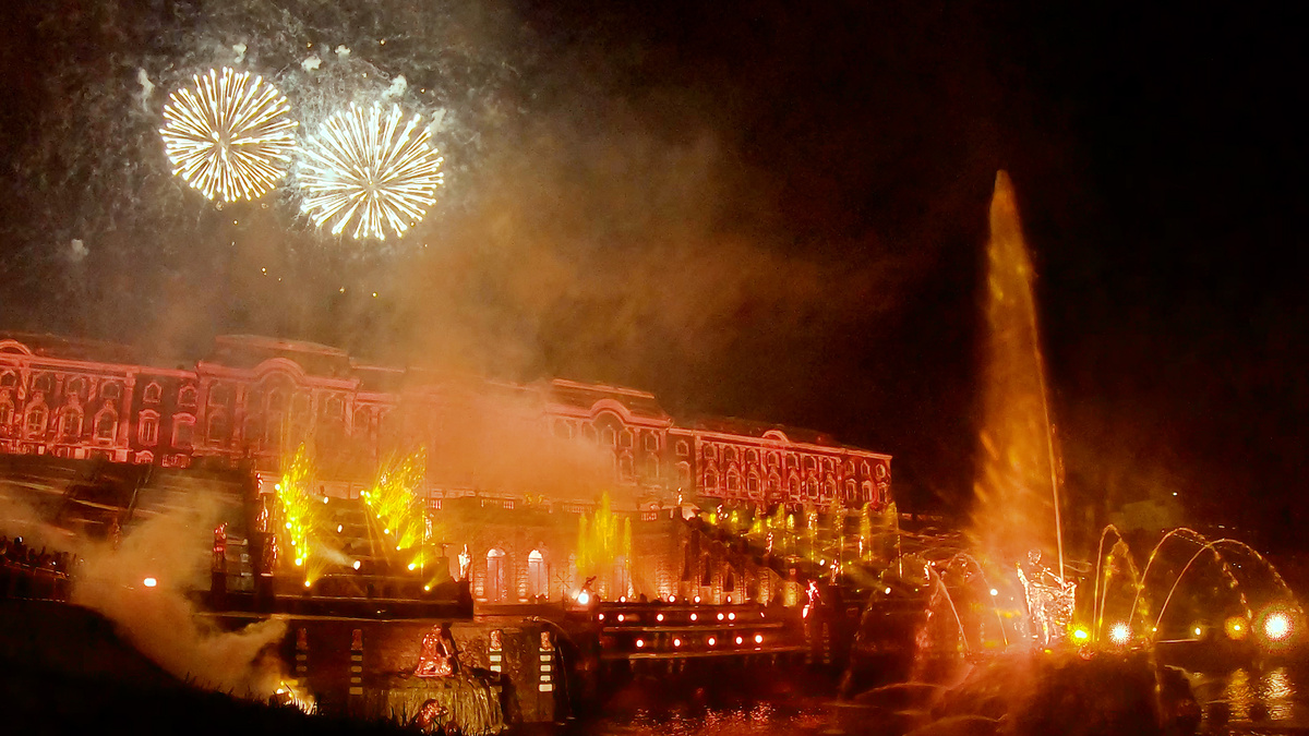 Как всегда, сюжет разворачивался по нарастающей: фонтаны вначале всегда выключены, и только ближе к концу их включают, в это же время все шоу достигает своей кульминации. Салют, огонь, вода, яркая подсветка и столп выды из «Самсона», медленно-медленно поднимающийся на высоту в 20 метров…