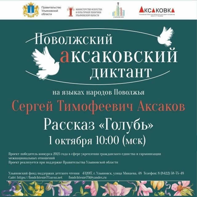 В Аксаковке проведут диктант на пяти языках народов Поволжья Ульяновский фонд поддержки детского чтения и библиотека имени Аксакова 1 октября проведут «Поволжский аксаковский диктант» по рассказу Сергея Аксакова «Голубь». Силами профессиональных литераторов произведение было переведёно на четыре языка: татарский, чувашский, мордовский и башкирский. Участие в диктанте бесплатное по регистрации. Начало в 11:00. Подписаться на наши новости