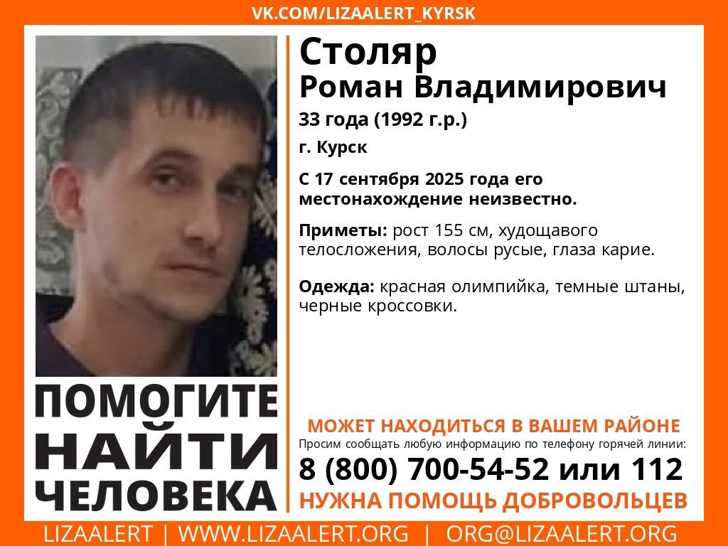 В Курске пропал 33-летний Роман Столяр Местонахождение Романа Владимировича неизвестно с 17 сентября 2025 года. - Просим всех неравнодушных курян помочь в поиске или поделиться любой и информацией о местонахождении мужчины, - рассказали представители Курского отряда LizaAlert. Роман худощавого телосложения, его рост 155 сантиметров, у него русые волосы и карие глаза. Он был одет в красную олимпийку, темные штаны и черные кроссовки.