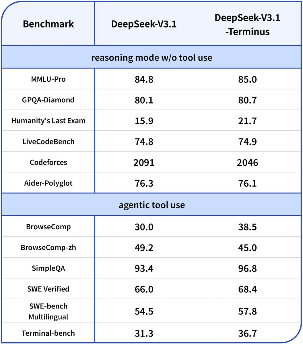 Вышла обновленная модель DeepSeek-V3.1 Новую версию назвали DeepSeek-V3.1-Terminus Улучшили работу в режиме агента и пофиксили проблему с отображением китайских символов посреди английского текста. Квантованных версий пока нет, но скоро будут тут.