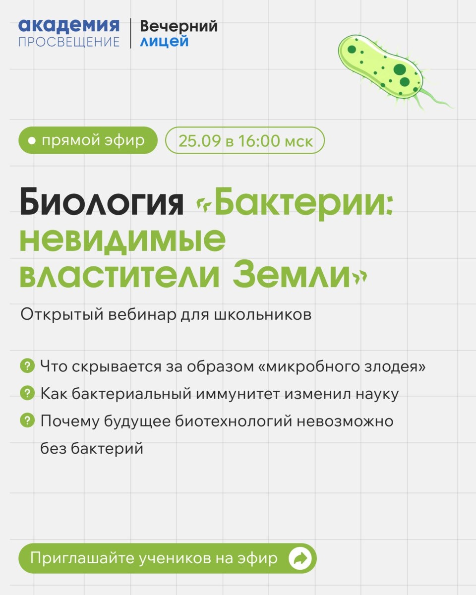 Они повсюду, они правят миром 🦠 25 сентября в 16:00 (мск) приглашаем всех школьников на открытый вебинар «Бактерии: невидимые властители Земли» 🔬На встрече вы узнаете: - Что скрывается за образом «микробного злодея» - Как бактериальный иммунитет изменил науку - Почему будущее биотехнологий невозможно без бактерий Регистрируйтесь по ссылке 👉 https://my.mts-link.ru/j/92685945/4041218115 Делитесь постом со всеми, кому интересна биология!