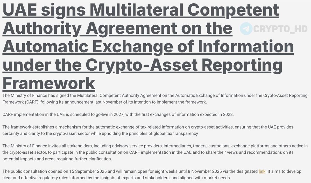 🇦🇪 ОАЭ подключаются к глобальному обмену данными о криптовалютных налогах – original ОАЭ подписали соглашение об автоматическом обмене налоговой информацией по криптоактивам в рамках стандарта CARF от ОЭСР. ➤ Внедрение – с 2027 года. ➤ Первый обмен данными – в 2028 году. ➤ Среди участников программы более 50 стран (Австрия, ОАЭ, Сингапур, Швейцария, Австралия, Южная Корея и др.) Весь список стран – смотреть Crypto Headlines