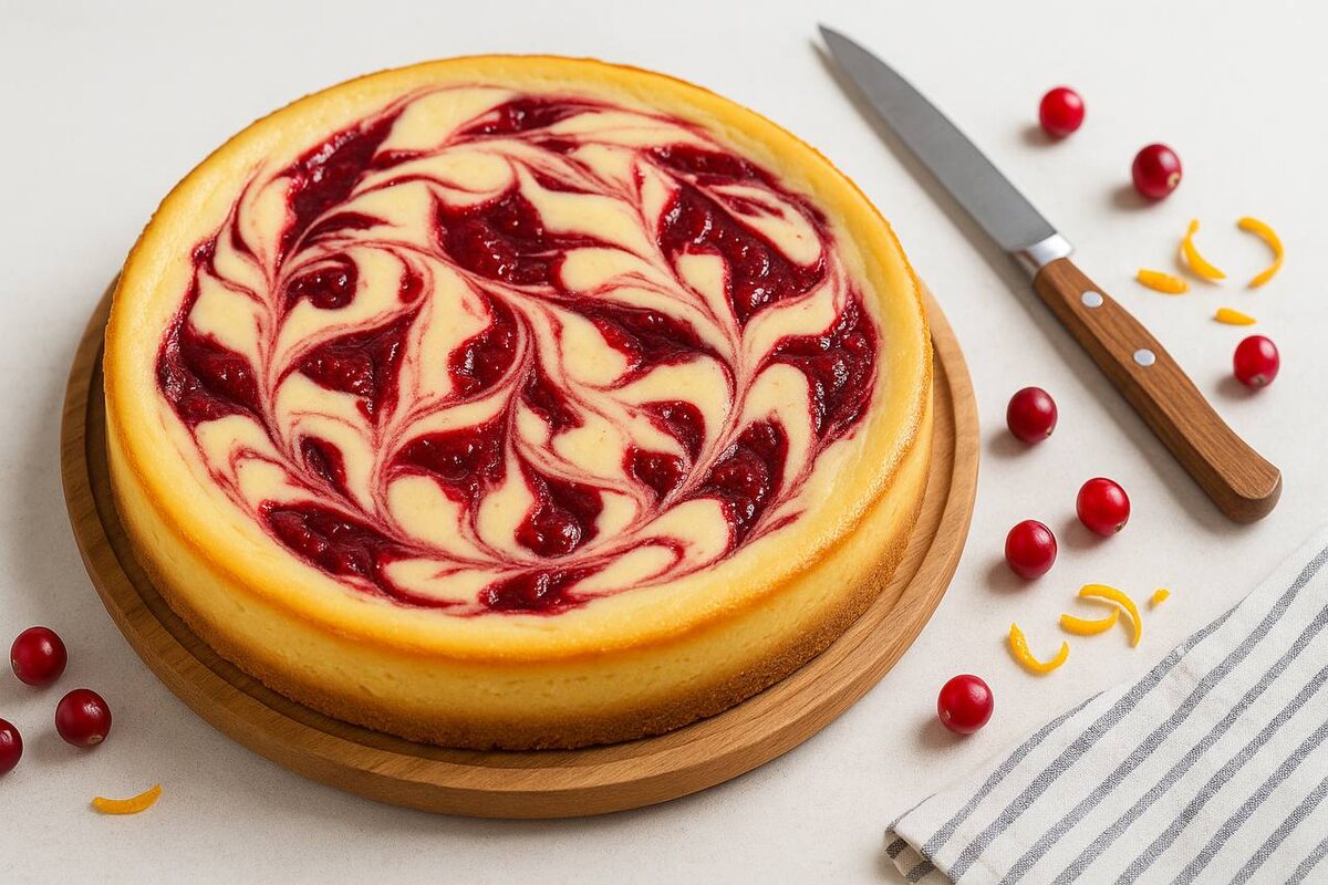 • Простой топпинг без выпечки. Сварите клюквенный соус: клюква + немного сахара + сок апельсина, 5–7 минут. Залейте на остывший чизкейк.