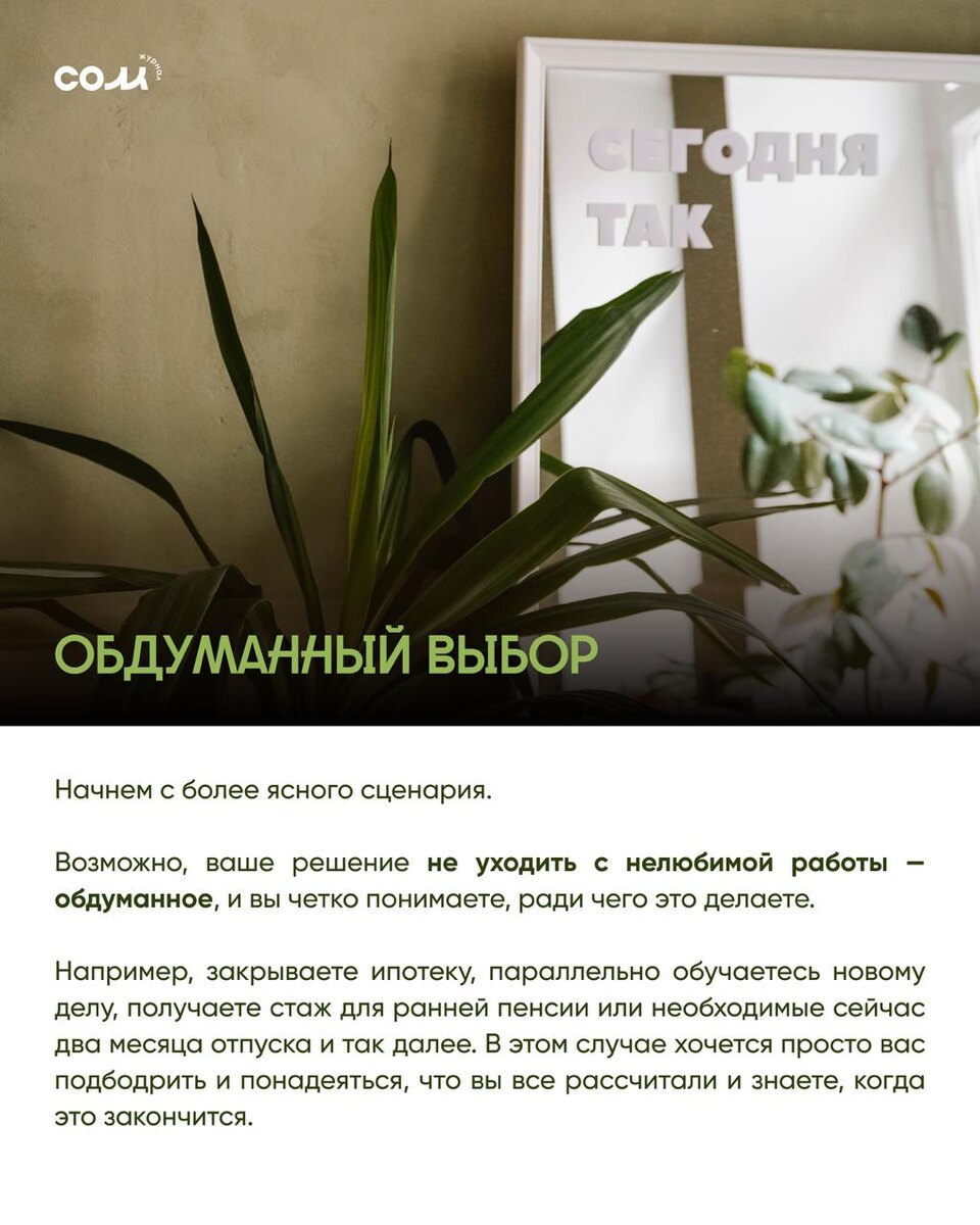 Почему я не могу уволиться с нелюбимой работы? Многие из нас, отдохнув и напутешествовавшись в летних отпусках, начинают задумываться «А не пора ли что-то менять?». И, конечно, наша работа подвергается ревизии в первую очередь. Если обнаружилось, что из приятного в ней — только деньги, и само собой назрело решение уволиться, но что-то все равно держит – эти карточки для вас. Автор текста — Екатерина Толстова, психолог-травматерапевт, нейрофизиолог и специалист самарского психологического проекта «Можно по-другому». Зарегистрироваться на воркшоп 28 сентября можно по ссылке, вход свободный. @somsomsom