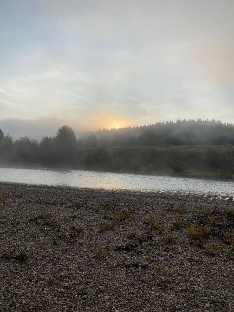 Здравствуйте! Это цикл статей под названием "Вишера". В нем я публикую свои заметки, которые ежедневно (а иногда и ежечасно) вела во время нашего сплава по реке северного Урала Вишере в сентябре 2025 года. В этих заметках я рассказываю о нашем быте, наших приключениях и впечатлениях. Действующие лица: я (автор канала - Екатерина), мой муж Алексей и наша собачка Нюша (она же Ню). Фото мои и их много. Надеюсь, Вам понравится! Как все начиналось можно прочитать здесь: 17.09. 10 день. Проснулись как и планировали пораньше- аж на целых 15 минут от времени обычного нашего пробуждения. Но позавтракали и собрались все равно быстро. 9:05 мы уже на воде. Сегодня ясно, вокруг клубы тумана. +3, на сидениях в лодке иней. Из-за верхушек деревьев на левом берегу встает солнце, но туман упорно отказывается покидать насиженные места. Буквально через 50 метров от нашей стоянки, в Вишеру впадает река Большой Щугор. Вода в ней до сих пор мутная-последствя хождения по руслу драги в поисках алмазов. На б