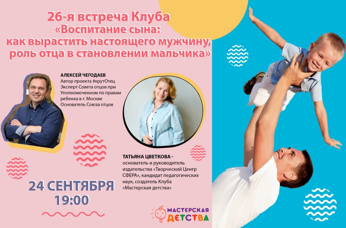 💯 Анонс 26-й встречи Клуба «Мастерская детства» Дорогие родители, рады поделиться с вами важной новостью — секретный гость раскрыт! На встрече мы будем говорить с Алексеем Чегодаевым — автором проекта #крутОтец, экспертом Совета отцов при Уполномоченном по правам ребёнка в Москве и основателем Союза отцов. ❗️ Тема встречи: «Воспитание сына: как вырастить настоящего мужчину, роль отца в становлении мальчика» В формате открытого интервью Татьяна Цветкова и Алексей Чегодаев обсудят: - как выстроить баланс между строгостью и заботой - что значит «ответственное отцовство» в современном мире - какие ошибки совершают родители в стремлении воспитать «сильного мужчину» - как семья закладывает основу будущей самостоятельности, честности и умения заботиться о других. ♥️ Эта встреча станет диалогом двух экспертов — кандидата педагогических наук и лидера отцовского движения. 💭 Когда: среда, 24 сентября ✏ Время: 19:00 (по мск) ✔ Формат: запись будет опубликована в соцсетях Клуба «Мастерская д