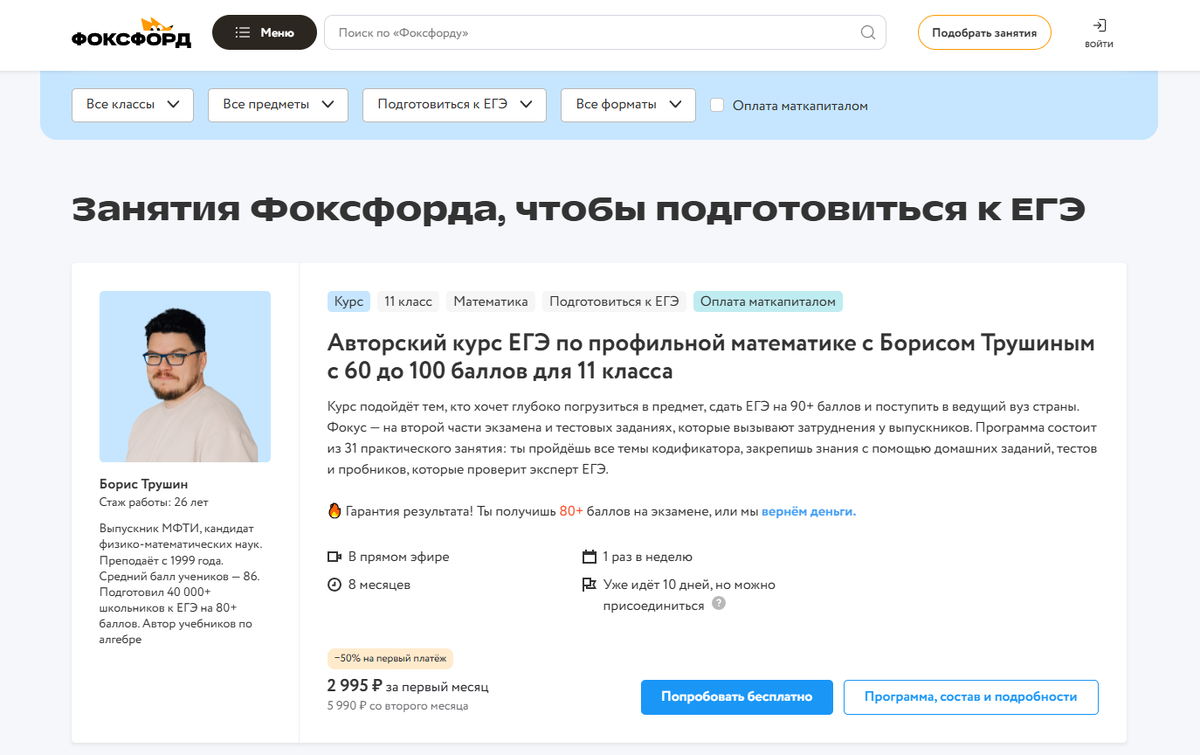Фоксфорд — одна из старейших и самых известных онлайн-школ в России, работающая с 2009 года. Здесь обучается более миллиона школьников, а преподавателями выступают эксперты ЕГЭ и ОГЭ, кандидаты наук и преподаватели ведущих вузов страны (МГУ, МФТИ, ВШЭ). Платформа предлагает годовые курсы, тематические модули и короткие интенсивы по всем предметам ЕГЭ. Обучение построено на сочетании живых занятий и видеоуроков, с обязательной практикой и проверкой знаний.