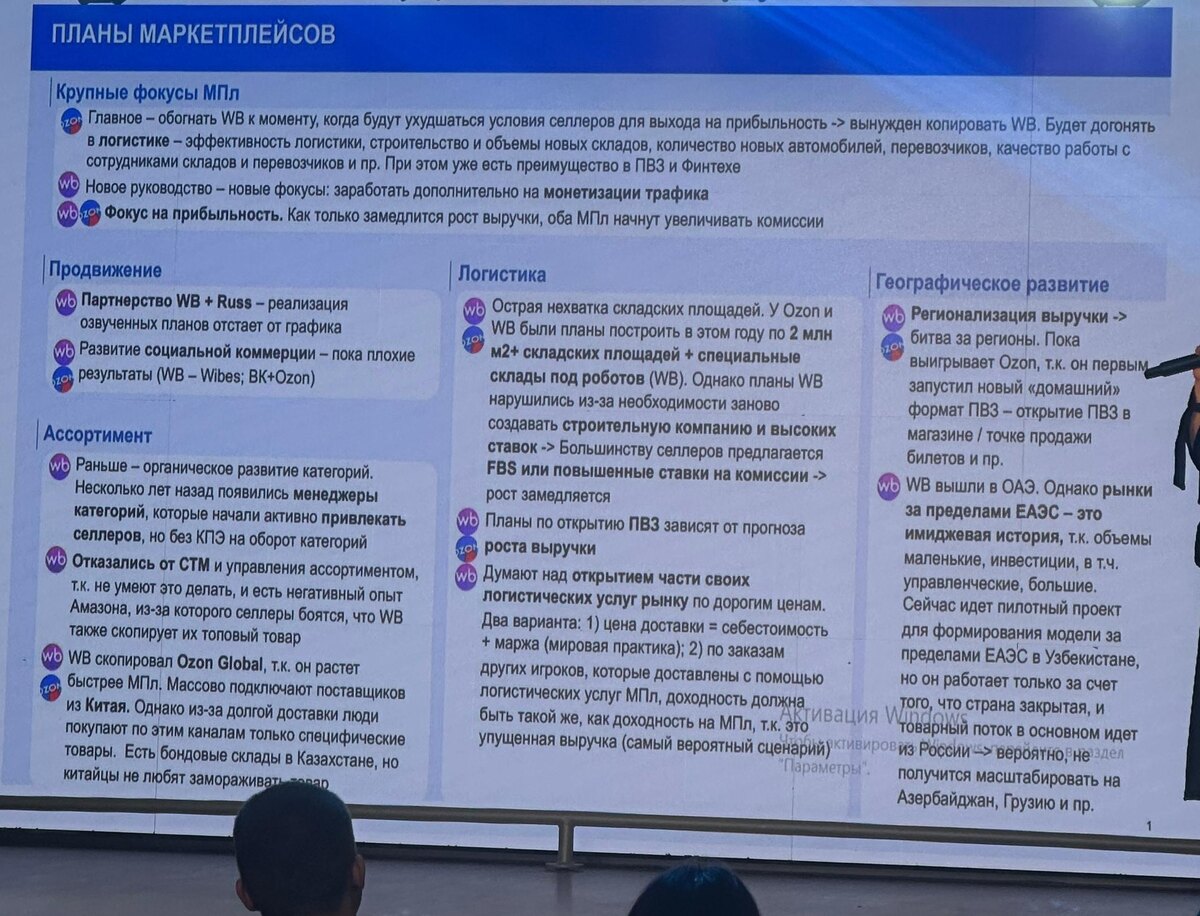 📌 На прошлой неделе был на форуме селлеров в Ульяновске. Выступала Золина Саральпова — человек, который больше 5 лет руководил отделом на WB. Показала интересный слайд о планах маркетплейсов. Делюсь с вами главными моментами и своими выводами: Фокусы маркетплейсов: 📈 Главная цель — прибыльность. Пока идёт рост выручки, комиссии будут держать, но как только рост замедлится — начнётся очередная волна повышений. 🚚 Логистика — у WB и Ozon катастрофическая нехватка складов, поэтому будут активно строить новые площади, внедрять роботов и усиливать контроль над ПВЗ. 🛍 Ассортимент — уже нет ограничений по категориям, наоборот, маркетплейсы сами начинают «вытягивать» селлеров. Но при этом уходят от STM (собственных торговых марок). 💳 Финтех и монетизация — оба МПЛ будут всё активнее зарабатывать на финансах и трафике. География: - Расширение за пределы ЕАЭС, но пока с осторожностью. В планах Азербайджан, Грузия, Узбекистан. Мой вывод: у маркетплейсов нет задачи «облегчить жизнь селлерам