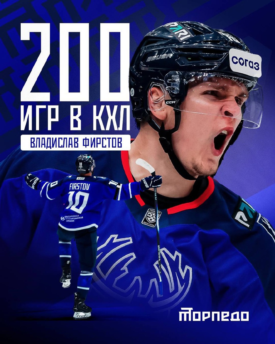 Форвард «Торпедо» 🦌 Владислав Фирстов сегодня проводит свой 200-й матч в КХЛ! Наши поздравления! Желаем удачи, голов и новых побед вместе с нашей командой! 👏