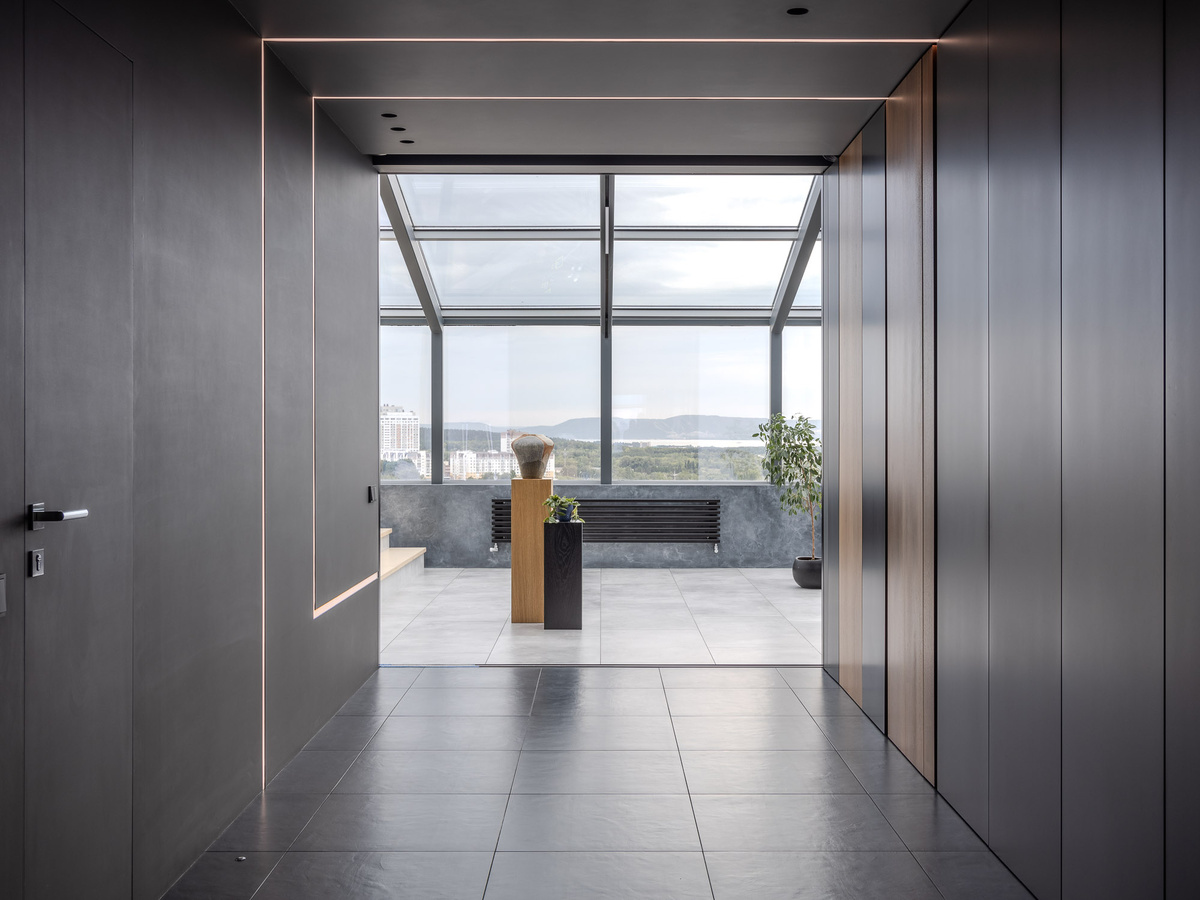 Самая главная достопримечательность этой квартиры — это остеклённая терраса, где открывается потрясающий вид. Мы намеренно делали проход к ней из гостиной через тёмный коридор, чтобы ещё больше усилить эффект выхода в светлое пространство. По первоначальному проекту на террасе планировались зимний сад и зоны отдыха, но в процессе реализации посадку зимнего сада долго откладывали. Со временем там появился тренажёрный зал, и сейчас это очень функциональное пространство. А ещё хочется отметить, как органично рядом со спортивной зоной вписался игровой комплекс для кошки. В таком открытом пространстве очень важна солнцезащита, и здесь у нас предусмотрены ролл-шторы на электроприводе.