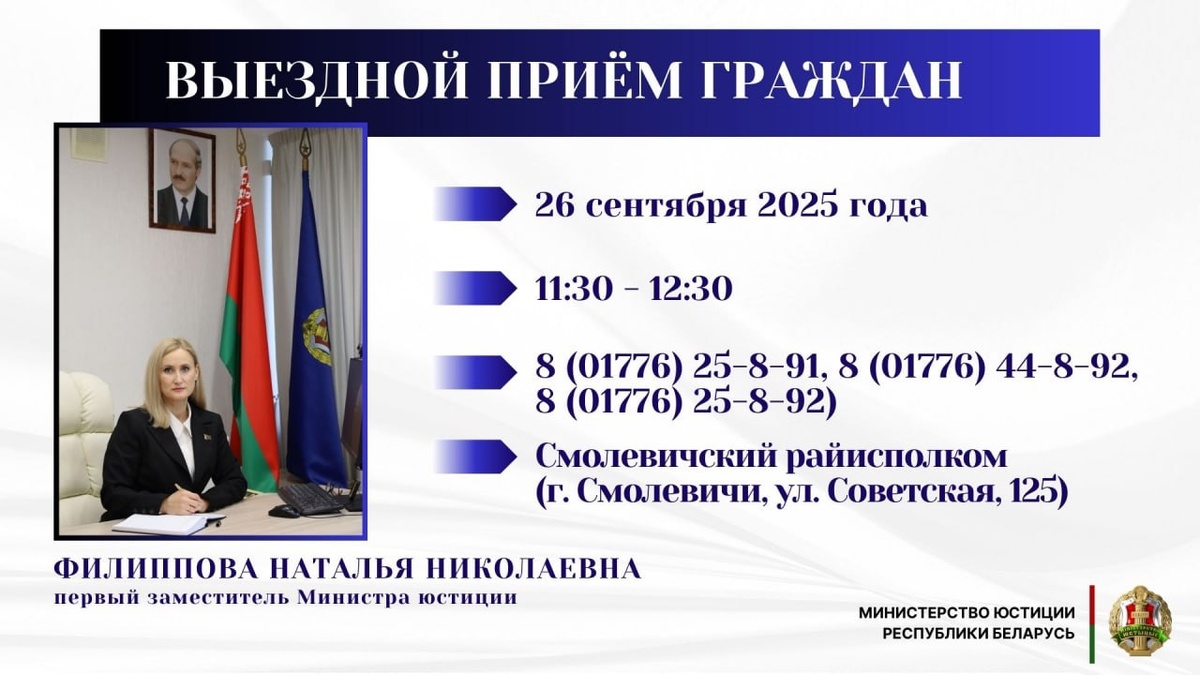 ☎️☎️☎️☎️☎️☎️☎️☎️ 🗓26 сентября 2025 года с 11:00 до 12:00 первый заместитель Министра юстиции Республики Беларусь Филиппова Наталья Николаевна проведет выездной прием граждан в Смолевичском районном исполнительном комитете (г. Смолевичи, ул. Советская, 125) по вопросам, относящимся к компетенции Министерства юстиции. 📞Предварительная запись на прием будет осуществляться через Смолевичский райисполком по телефонам: 8 (01776) 25-8-91, 8 (01776) 44-8-92, 8 (01776) 25-8-92). 💪💪💪💪| Сайт | Telegram | Instagram | Fb | X | Ok | VK | YouTubе