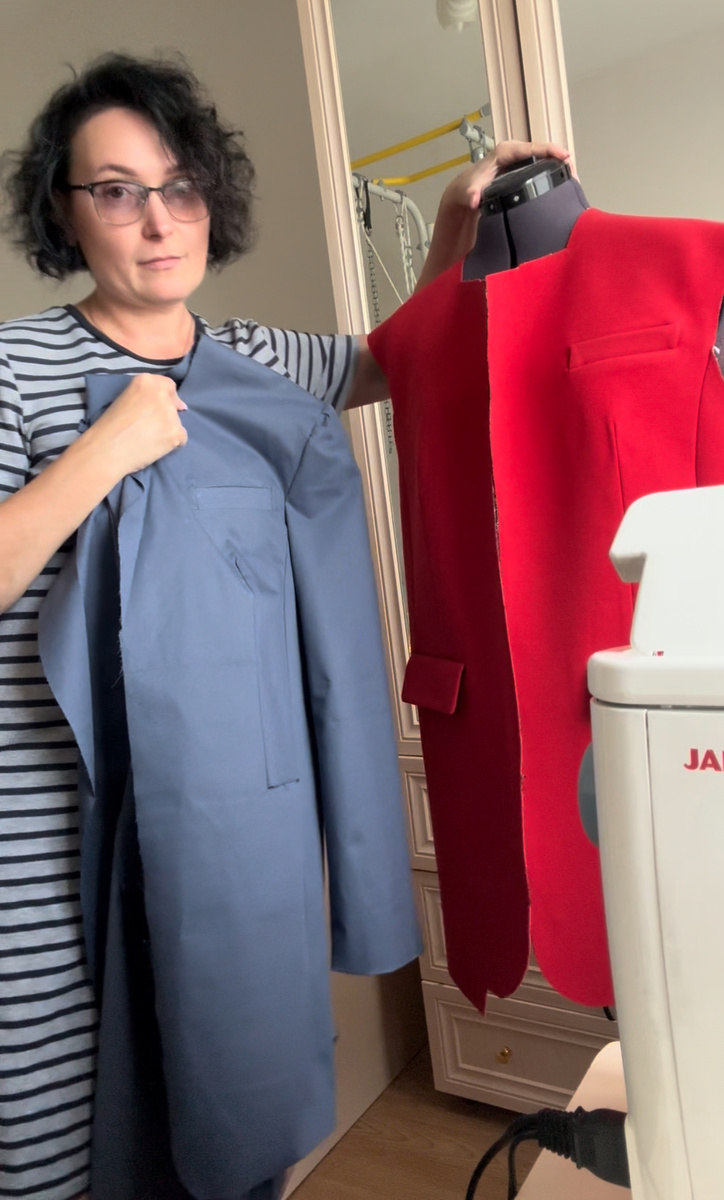 Если коротко: я не собиралась устраивать эксперимент века. Просто шила макет пальто из плотного хлопка, чтобы «посмотреть посадку». Кто подписан на мою группу в ВК, уже видел фоточку этого добропорядочного серо-синего материала и мой невинный план: выкройка - примерка - корректировки - дальше в приличную ткань. Но. История решила повернуть не туда.