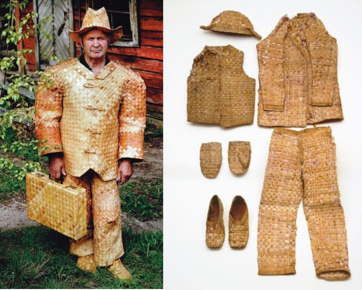 Этого человека в плетеном костюме и с плетеным же дипломатом вы могли встречать в мемах и прочих публикациях, но кто он? Его зовут Эркки Пеккаринен, он родился в 1936 году в семье плотника, и еще в юности, работая на лесопилке, при обилии материала, увлекся плетением из бересты. Костюм, так впечатливший пользователей интернета и сделавший мастера известным, выполнен еще четверть века назад, для выставок. Помимо костюма, Пеккаринен известен еще и рекордами, вошедшими в Книгу рекордов Гиннеса в 1998 году: самые большие лапти в 2,7 метра и самые маленькие - 3,8 миллиметра. Эркки не продаёт свои работы, но, позиционируя себя продолжателем исчезающей финской культуры берестяного плетения, охотно готов делиться знаниями. Так, например, мастер утверждает, что владеет технологией снятия бересты с живого дерева, без вреда для последнего.