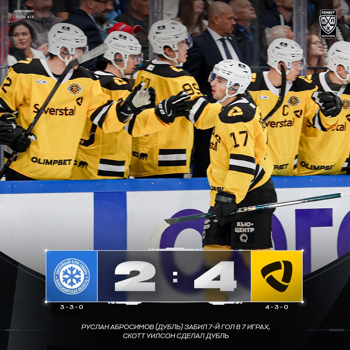 🟡 Дубль Руслана Абросимова принес «Северстали» победу на старте выездной серии! #ФонбетКХЛ