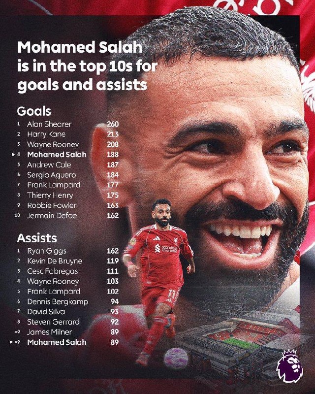 Теперь Мохамед Салах из "Ливерпуля" входит в топ-10 и лучших бомбардиров, и лучших ассистентов Премьер-Лиги всех времен 🔝
