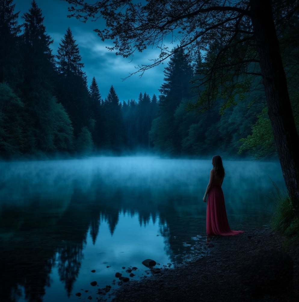Однажды женщина, вопреки предупреждению, пошла туда одна. Лес стал странно тихим — даже насекомые замолкли. Вдруг впереди блеснул свет, будто луна отразилась в воде, и она вышла к берегу. Озеро лежало перед ней, неподвижное, как зеркало. В отражении она увидела себя… но только та, что внизу, улыбалась шире, чем позволяли её губы.