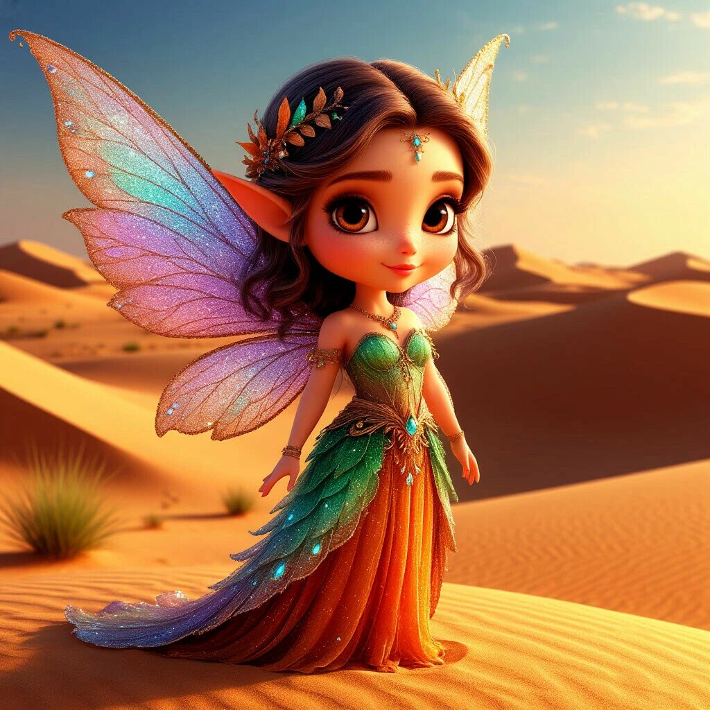 В бескрайней, знойной пустыне, где песок шептал древние тайны под палящим солнцем, жила фея по имени Амира. Она не была похожа на фей из зеленых лесов или прохладных долин. Ее крылья переливались всеми оттенками заката, а платье было соткано из тончайшего песка, мерцающего, как драгоценные камни.
