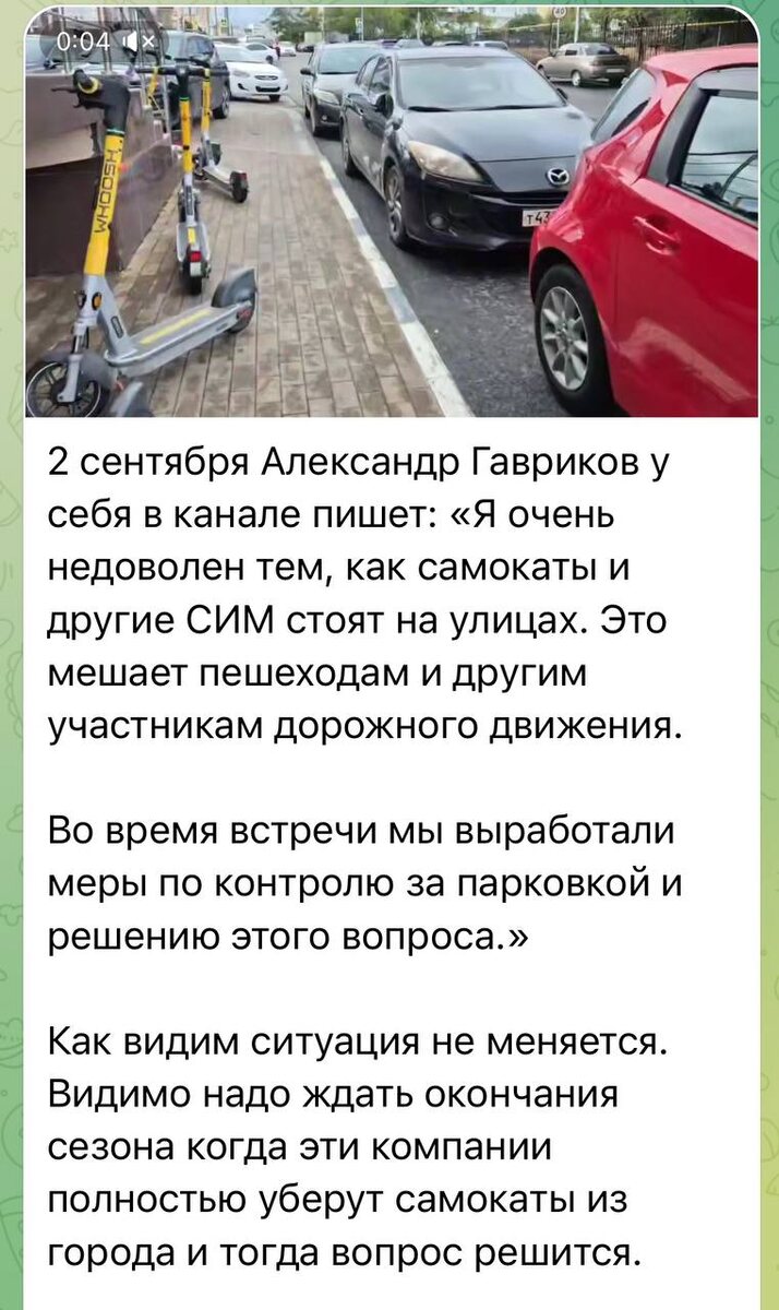 🛴Специалистами ежедневно проводится мониторинг на предмет стихийно брошеных объектов СИМ. Информация незамедлительно направляется представителям кикшеринговых компаний для оперативной отработки. Также кикшеринговые компании самостоятельно в круглосуточном режиме отслеживают через приложения средства индивидуальной мобильности (СИМ) оставленные пользователями вне зоны утвержденных реестром а также обозначенной разметкой для оперативной ликвидации стихийных парковок СИМ. Ликвидация производится пешими сотрудниками а также грузовым автомобилем в зависимости от количества СИМ расположенных в неположенных местах. 💬Если вы видите, что кто-то оставил самокат или другое СИМ в неположенном месте, пожалуйста, пришлите мне фото с адресом в чат. 🤝Пожалуйста, не оставляйте самокаты в неположенных местах. Давайте вместе сделаем наш город-герой комфортнее и безопаснее для всех. ℹ️ Замглавы г. Новороссийска Гавриков Александр 🤩 Подписаться | 📱 БОТ |⚡️ Буст