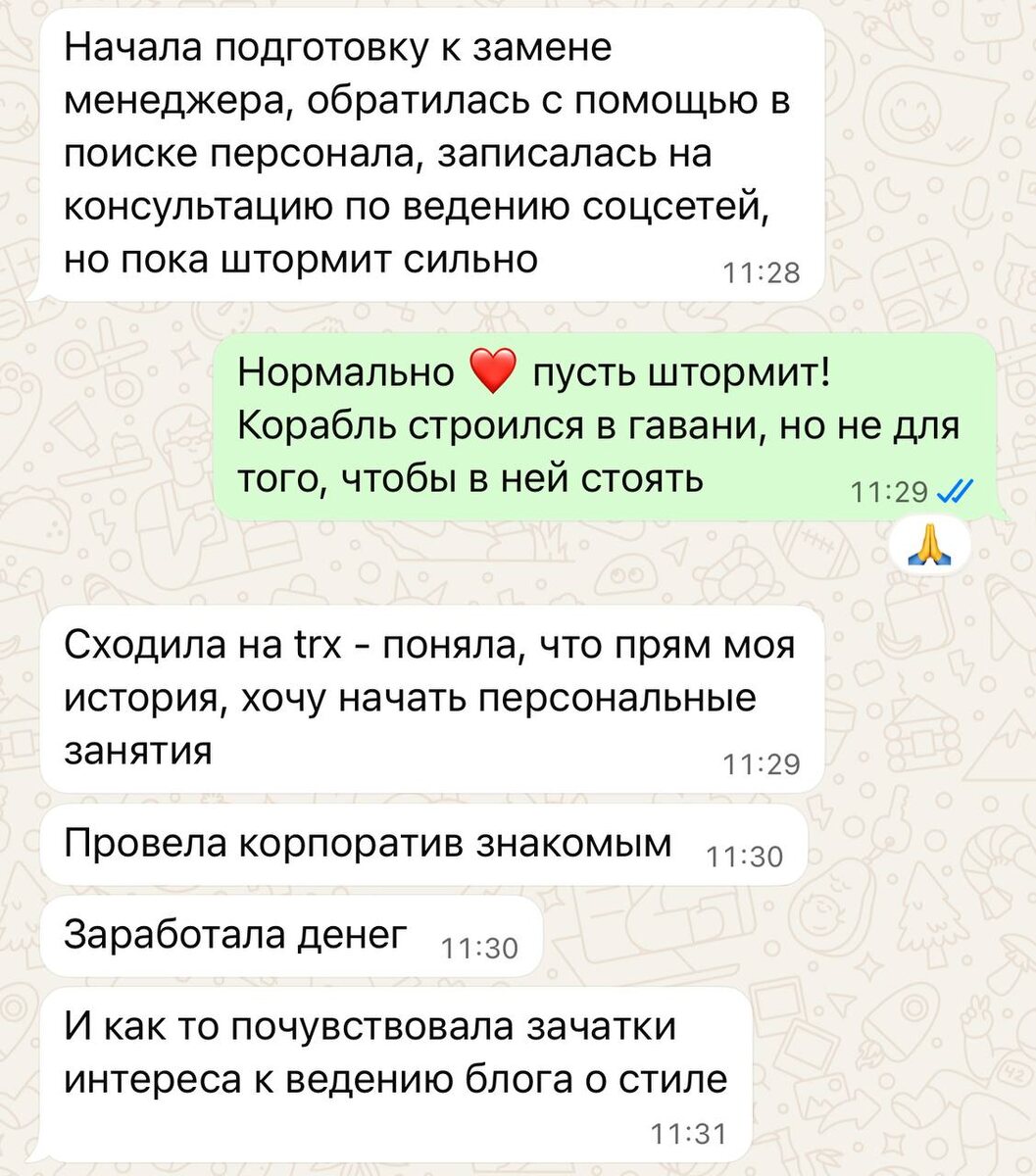 «Слушай, собаку завела; нашла партнёра по бизнесу; заработала денег; взяла тренера по спорту; гуляю; немного штормит.