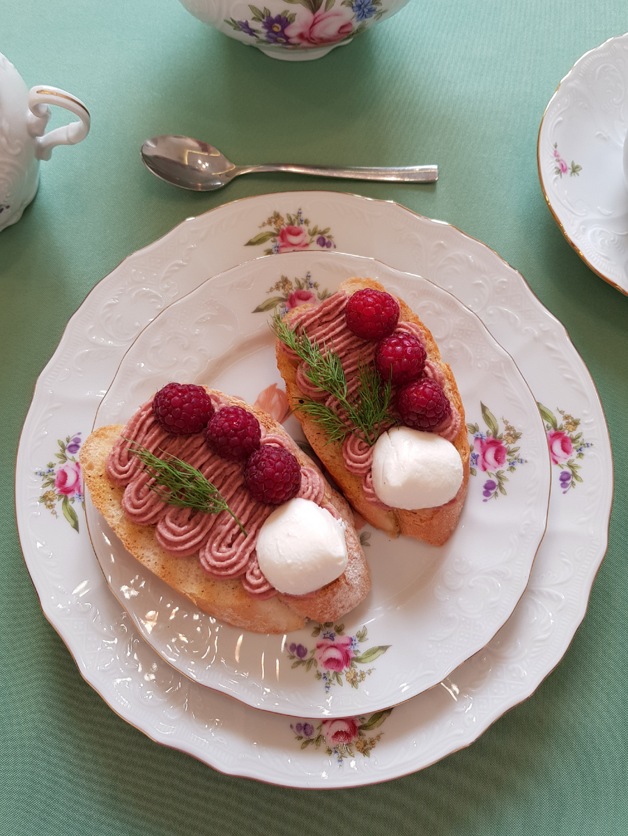 Доброе утро, дорогие друзья! Солнечное осеннее, прохладное утро хочется начать с прогулки, а после этого насладиться горячим чаем с сытной брускеттой. Для приготовления нам понадобятся: 1 багет, 100 грамм паштета, 2 шарика моцареллы по 25 грамм, малина 12 штук, 30 грамм оливкового масла, 1 зубчик чеснока, черный перец, укроп. Приготовление: багет нарезать ломтиками наискосок и подсушить на гриле без масла при температуре 200 градусов Цельсия. Подсушенный батон натереть с одной стороны чесноком. Полить ломтики оливковым маслом и распределить оливковое масло с помощью кулинарной кисти, поперчить. Выложить паштет в кулинарный мешок с насадкой. Нанести паштет с помощью кулинарного мешка на ломтики батона зигзагами. Дополнить брускетты малиной и половинками моцареллы. Украсить блюдо веточками укропа. Разложить брускетты по тарелкам. Приятного аппетита! Если использовать для приготовления брускетт паштет из говядины домашнего приготовления, то 4 брускетты получатся на 118 калорий мень
