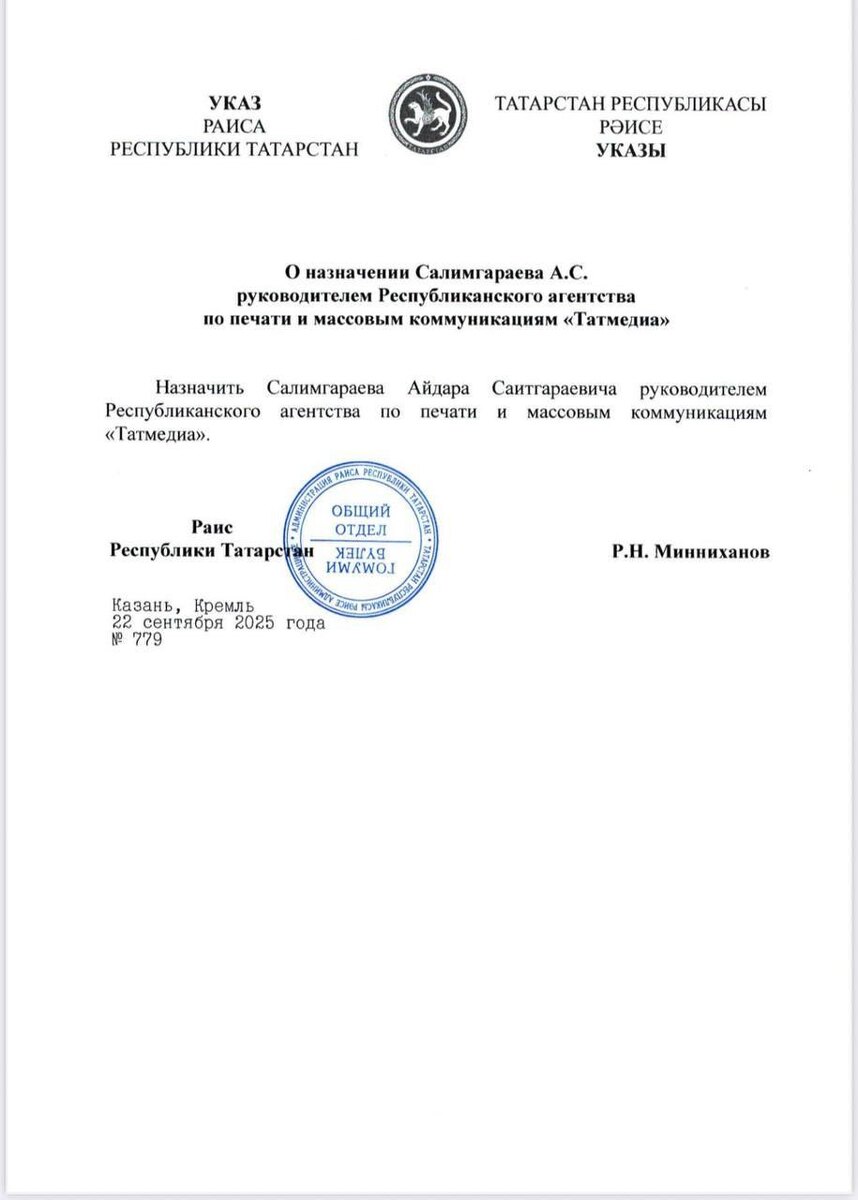 В ответ на пост ✍️❕Раис Татарстана подписал следующие указы о назначении руководителей 🔹Руководителем Республиканского агентства «Татмедиа» переназначен Айдар Салимгараев. 🔹Начальником Главного управления ветеринарии назначен Тимур Галеев. 🔹Начальником Управления записи актов гражданского состояния назначена Эльвира Ахметова. @tatmediaofficial | Все каналы Татмедиа ™️ 1-й новостной MAX-канал Татарстана - подпишитесь.