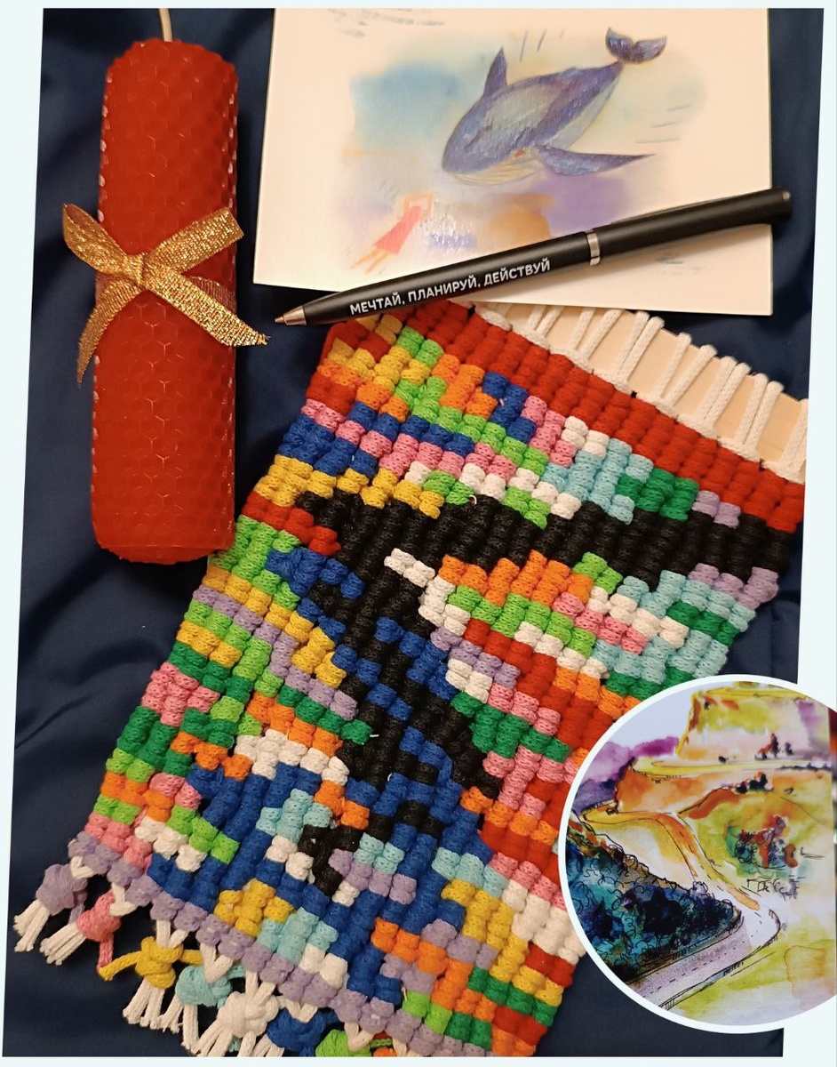 Интеграция Тени через смыслоплетение Да-да, так тоже можно! И кто заглядывал в мои субботние сторис @Ali_Yashka, тот видел, что я весь день провела на фестивале сообщества "Познай себя". К слову, в удивительно атмосферном месте – в Доме винтажной музыки. Про это тоже в сторис можно посмотреть. Возвращаюсь к своей Тени. Про нее писала выше. Задумала я наконец-то дать ей место в своей жизни – интегрировать ее качества. С этим намерением и ехала к Светлане Овсянниковой и ее смыслоплетением. Верхние пару красных рядов в работе – дались не просто. Нити разбегались, норовили с палочки соскочить. Проживалось глубоко, страх, опасения, стыд всё тот же... А потом я решила спросить у МАК какие цвета мне добавить в картинку. Мне выпала достаточно пестрая картинка с горной дорогой (см. кружок на 1-м фото). И я пустилась импровизировать с нитями и цветами, на основе этой картинки. Как я поняла, так никто ранее не делал. У меня аж 11 цветных нитей переплелись между собой. Число 11 в нумеролог