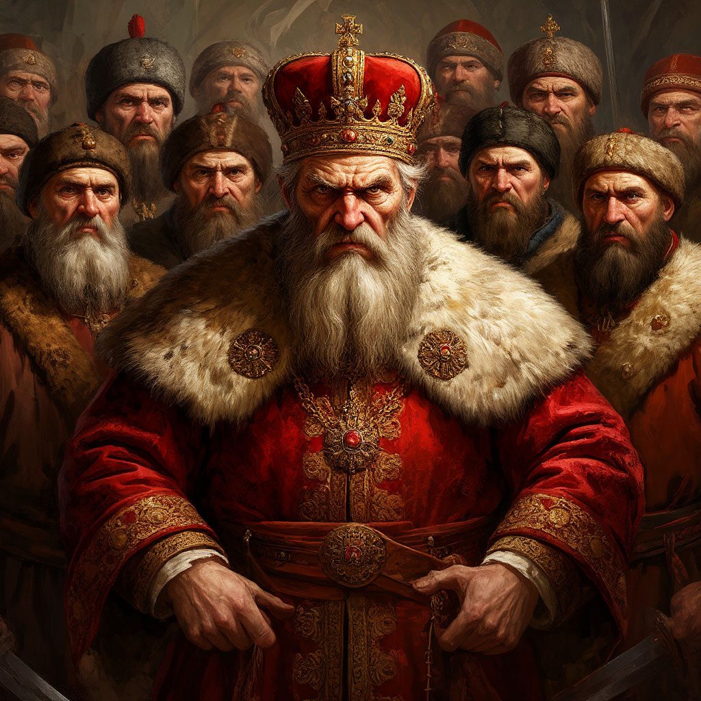 В далёком-далёком царстве-государстве ходила молва, что царь на троне сидит добрый, да только бояре вокруг него нехорошие, скрывают от него правду о том, что творится в землях тех. Если бы только царь узнал обо всём, он тут же навёл бы порядок, и зажили бы люди в обещанном раю. Однако все эти сказочники упускают из виду одну важную деталь. Царь сам выбирает большинство своих приближённых бояр, а значит, несёт за них полную ответственность. И, конечно, ему обо всём известно. А добрые цари, к сожалению, встречаются лишь в сказках. Но в тридесятом царстве многие верят, что такие цари бывают и в реальности. Хотя добрый царь не просидит на троне и года. Недоброе окружение попросит подвинуться. Ну он и подвинется, он же добрый. Собрались однажды царь и его приближённые за большим столом, чтобы решить, кого назначить на важные должности. Умных и образованных сразу же отсеяли, потому что такие люди не нужны. Они ведь могут начать работать, а не только деньги из казны выносить. А как на этом фо