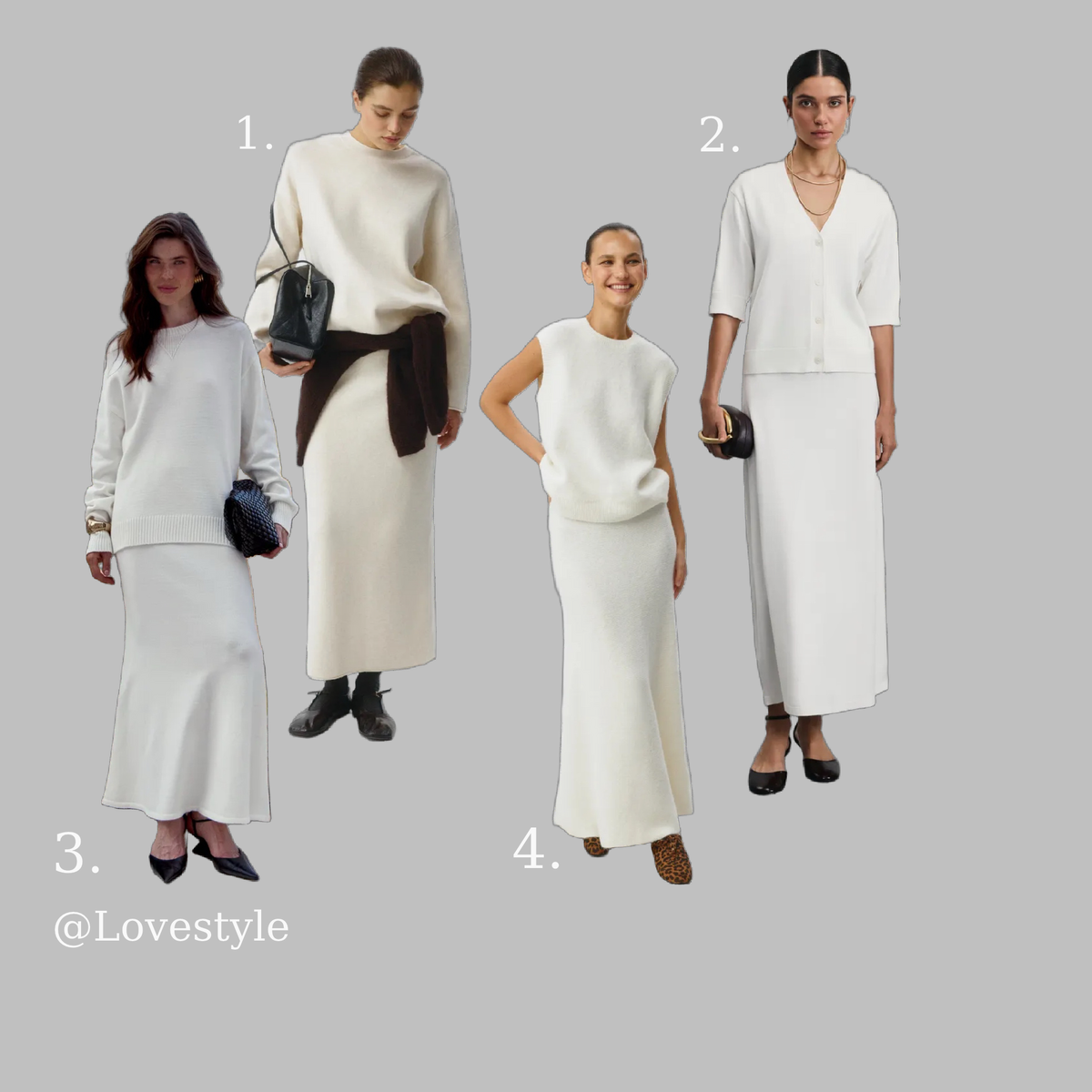Здравствуйте, дорогие читатели! Первый месяц осени подходит к концу, а это значит, что летние вещи отодвигаются в дальний угол и все больше хочется надеть что-то уютное. Уютным может быть не только объемный свитер , но и трикотажный костюм. Сегодня поговорим не о брючных костюмах , а о костюмах с юбкой. 1.джемпер - 500300368, юбка -500300406. 2.джемпер-450228551, юбка -450228545. 3.костюм - 452990688. 4.джемпер- 485135524, юбка -485136200. Куда же мы без «сливочного масла»?! Этот нежный цвет запал в души большинства, а какие вкусные с ним цветовые сочетания ! Здесь можно прочесть статью об этих сочетаниях и применять в своих образах. 1.костюм -418173200. 2.джемпер-489467841, юбка - 466796254. 3.костюм-478007105. 2.джемпер - 492943692, юбка -494877076. 3.джемпер- 455439473, юбка- 486768955 5.джемпер- 455449616, юбка- 455473276. 4.джемпер- 453910322, юбка - 453910475. 1.джемпер-491770402, юбка- 491770591. 2.кардиган- 448000781, юбка-447904244. 3.джемпер -417718556, юбка -452990687. 4.ка