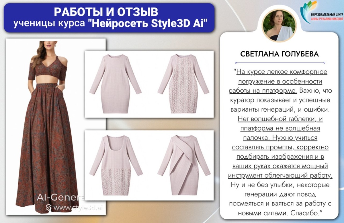 ✨ Нейросеть – это не волшебная кнопка, которая решает всё сама, это инструмент, которым можно научиться пользоваться. Мы часто говорим об этом – и здорово, когда ученики сами приходят к такому пониманию в процессе работы. 💬 Вот какие выводы сделала ученица мини-курса «Нейросеть Style3D AI: генерация эскизов, фотографий и видео» Светлана Голубева: Мой опыт получился забавным, промпт подошел только с третьего раза - дописывала нюансы. Из предложенных четырех вариантов подходит только один, и все равно есть детали, которые ИИ не захотел делать. Волшебной кнопки нет - любой навык нужно отрабатывать, чтобы понимать возможности инструмента Инструмент «Создание эскиза по модели» интересный, но с особенностями. Все-таки для классического техрисунка не подходит - объемный и более художественный, ну и наличие фигуры на которую надет не всегда нужно. В общем как и во всем нужно подстраиваться и искать варианты реализации - и это не плохо Оторваться от инструмента «Виртуальная примерка» было сло