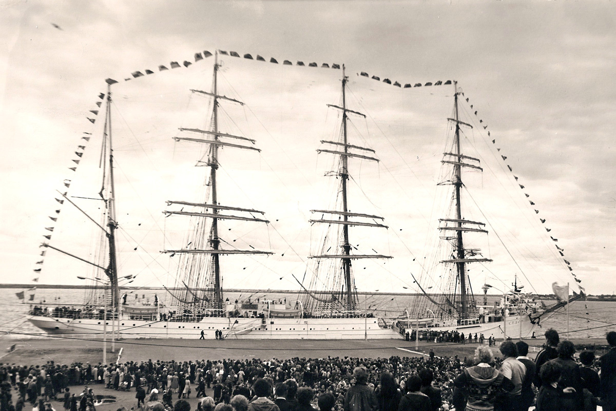 Гвоздём программы несомненно были сами суда: маленькие и большие, деревянные и стальные, древние и современные. Подзнаменованные общим для всех ветряным движителем — парусом. Каждое судно, гордое своей историей, принимало посетителей. Советские, самые большие в мире парусники, не были исключением. Объявили день открытых дверей. Выстроились длинные, на сотни метров в длину очереди из желающих подняться на борт какого-нибудь парусника. Без преувеличения (но и без скромности) скажу, что самая длинная очередь была именно на “Седов”.