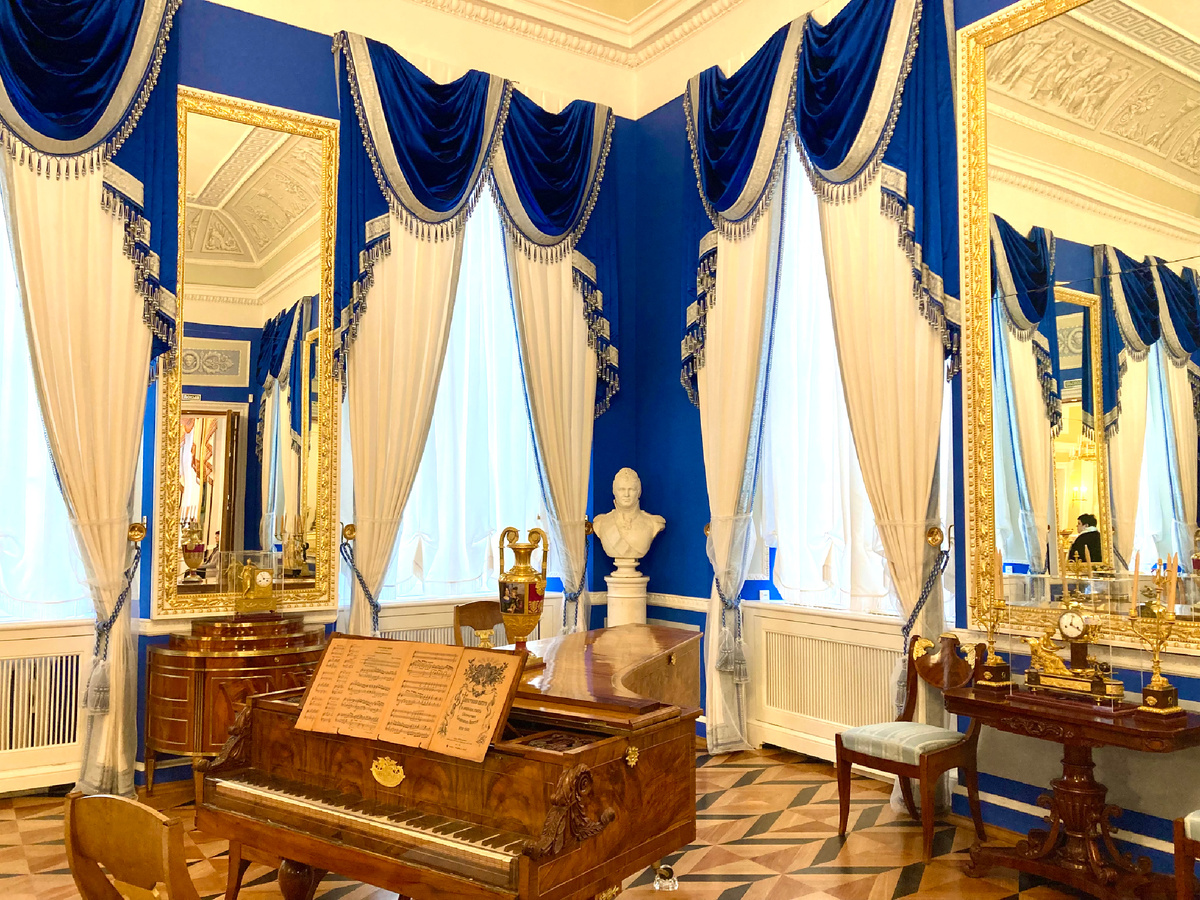 Осеннее время одно из лучших сезонов для посещения дворцов Петергофа. Вход в парк для туристов свободный. Дворцы платные, но не настолько. Здесь тот случай, когда ценность увиденного будет выше цены по прейскуранту. Екатерининский корпус привлекателен интерьерами и коллекцией оригинальной фарфоровой посуды, сохранившейся со времён Александра Первого. Екатерининский корпус один из тех дворцов, где на квадратный метр приходится больше ценностей, чем в других музеях Петербурга. Прежде чем расскажу о Желтом зале, опишу ещё одно замечательное помещение - Синяя гостиная. Гостиная решена в конструктивном ампире. Стиль хорошо гармонирует с ее назначением. В центре помещения рояль петербургской фабрики И.-А. Тишнера. Музицирование и пение было любимым занятием императриц и фрейлин, как и их галантных кавалеров. Обстановка великосветского музыкального салона подчёркнута деталями интерьера в форме древнегреческого музыкального инструмента - лиры. В дизайне спинок стульев, бра, светильников