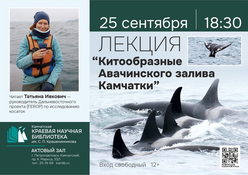 📌 Жителям Камчатки расскажут о китообразных гостях Авачинского залива Лекция «Китообразные Авачинского залива Камчатки» пройдет 25 сентября в Камчатской краевой научной библиотеке им. С.П. Крашенинникова, передает агентство «КАМЧАТКА-ИНФОРМ». Лекция пройдет в актовом зале библиотеки. Начало в 18:30 четверга. Вход свободный. Возрастное ограничение: 12+. Руководитель Дальневосточного проекта (FEROP) по исследованию косаток - Татьяна Ивкович расскажет о биологии китообразных, которые чаще всего встречались в Авачинском заливе летом 2025 года: косаток горбатых и серых китах, финвалах. «На лекции Татьяна Ивкович подведет итоги Дальневосточного проекта по косаткам в 2025 году. Так же вы узнаете историю детеныша Фродо, который попал в пластиковое кольцо. Посетителям представится прекрасная возможность расширить свои знания о морской фауне Камчатки, узнать о важности научных исследований и вдохновиться примером неравнодушных людей, посвятивших себя изучению и защите китообразных», - сообщ