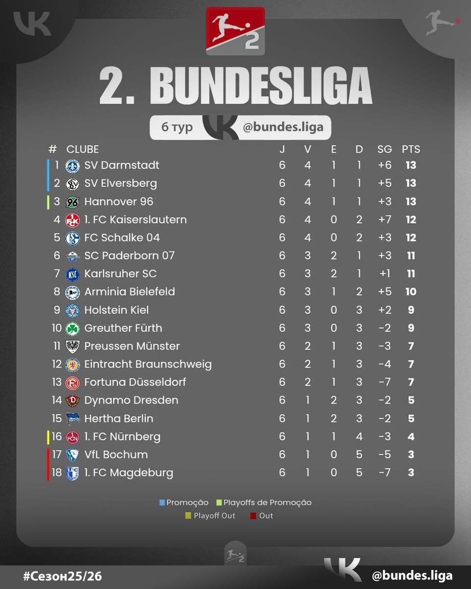 #2Бундеслига ⚽ Результаты 6 тура + Таблица 🔥 Хольштайн Киль 3:0 Карлсруэ Фортуна 0:3 Дармштадт Динамо Дрезден 2:2 Ганновер 96 Магдебург 0:2 Шальке 04 Айнтрахт Бр 1:4 Эльверсберг Герта 0:2 Падерборн Нюрнберг 2:1 Бохум Арминия 1:3 Гройтер Фюрт Кайзерслаутерн 4:1 Пройссен Мюнстер 🏁 По итогам шести туров лидерство захватил "Дармштадт", который делит первую строчку с двумя клубами, но по разнице мячей лучший на данный момент. "Кайзерслаутерн" и "Шальке 04" в топ-5. Отметим, покинувшего последнюю строчку "Нюрнберг" 🤪